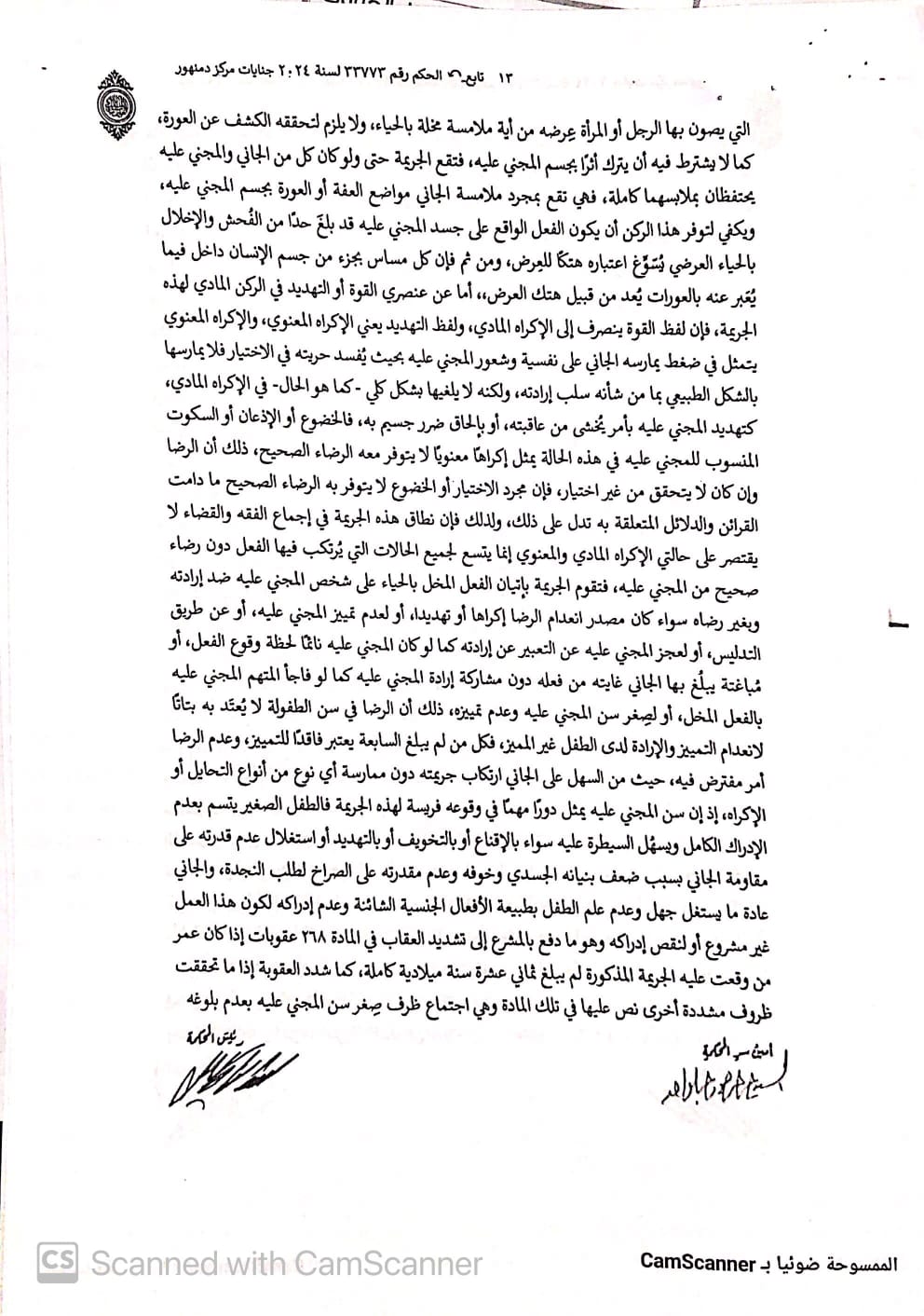 وأشارت المحكمة في حيثيات حكمها إلى أركان جناية هتك العرض بالقوة، موضحة أن: الركن المادي لهذه الجريمة يشمل الفعل بالحياء وهو سلوك الجاني، فضلَا عن عنصري القوة أو التهديد، فالحق المُعتَدى عليه بهتك العرض في جناية المادة 268 من قانون العقوبات هو الحرية الجنسية للمجني عليه أيًا كان، رجلًا أو امرأة، طفلًا أو طفلة، ويتميز الفعل الذي يقوم به هتك العرض في هذه الجريمة بمساسه بجسم المجني عليه، فهو الإخلال العمدي بالحياء العرضي بفعل يقع على جسم المجني عليه ويستطيل إلى جسمه وليس عورة فيه وخدش عاطفة الحياء عنده من هذه الناحية، إذ إن الفكرة الأساسية فيه أنه يمس حصانة الجسم وحماية المناعة الأدبية التي يصون بها الرجل أو المرأة يعرضه من أية ملامسة مخلة بالحياء، ولا يلزم لتحققه الكشف عن العورة، كما لا يشترط فيه أن يترك أثرًا بجسم المجني عليه، فتقع الجريمة حتى ولو كان كل من الجاني والمجني عليه يحتفظان بملابسهما كاملة، فهي تقع بمجرد ملامسة الجاني مواضع العورة بجسم المجني عليه.