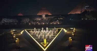 والتي بدأت بعرضٍ فني بعنوان “العالم يعزف لحناً واحداً”، أعقبه عرض “الليزر والدرونز”، والذي شرح نظرية “حزام اوريون”، وعلاقة بناء المتحف المصري الكبير بالأهرامات،