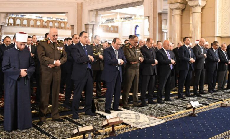 والتي قدم خلالها التهنئة للسيد الرئيس وللشعب المصري بمناسبة عيد الفطر المبارك، كما أثنى على ما تشهده مصر في عهد السيد الرئيس من أمن وأمان واستقرار وعمران. وعقب الصلاة؛ تبادل السيد الرئيس مع السادة الحضور التهاني بهذه المناسبة المباركة.