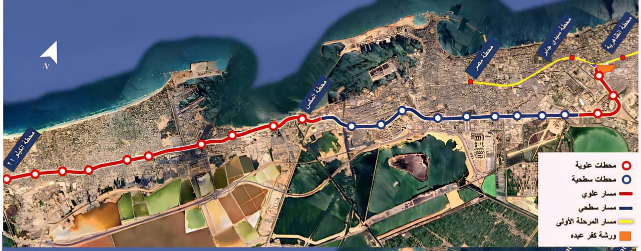 تمتد بطول 31 كم (19 كم علوي- 12 كم سطحي) وعدد 22 محطةمن بعد محطة الظاهرية حتى الكيلومتر 21 في مسار علوي، ثم يتحول إلى مسار سطحي ضمن حرم السكة الحديد حتى يصل إلى محطة المكس، ثم يمتد مرة أخرى في مسار علوي حتى الكيلومتر 21 عبر طريق الإسكندرية/مطروح