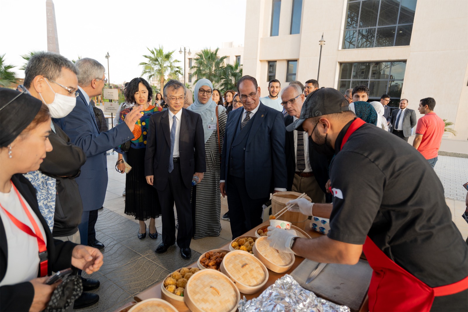 والسفير أوكا هيروشي، سفير اليابان لدى مصر والسيده حرمه ،والدكتور هاشيموتو شوغي، نائب رئيس الجامعة للشئون الإقليمية والدولية، و الدكتور سامح ندا، نائب رئيس الجامعة للشئون الأكاديمية و التعليم.