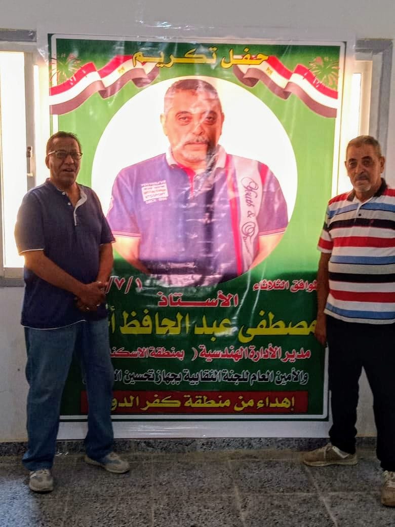 وفي أجواء من التقدير والوفاء، أقيم حفل تكريم للأستاذ مصطفى عبدالحافظ مدير ادارة الهيئه الهندسيه لجهاز تحسين الاراضي الزراعية من وزارة الزراعة واستصلاح الأراضي – الهيئة العامة للجهاز التنفيذي لمشروعات تحسين الأراضي، الإدارة العامة بالإسكندرية – منطقة برج العرب،