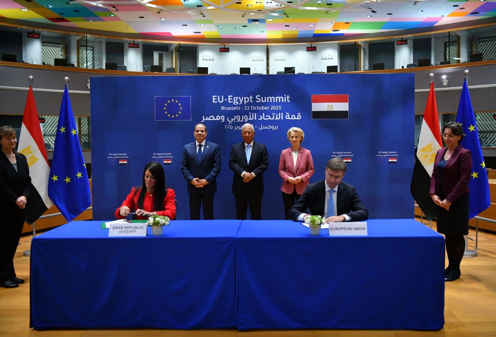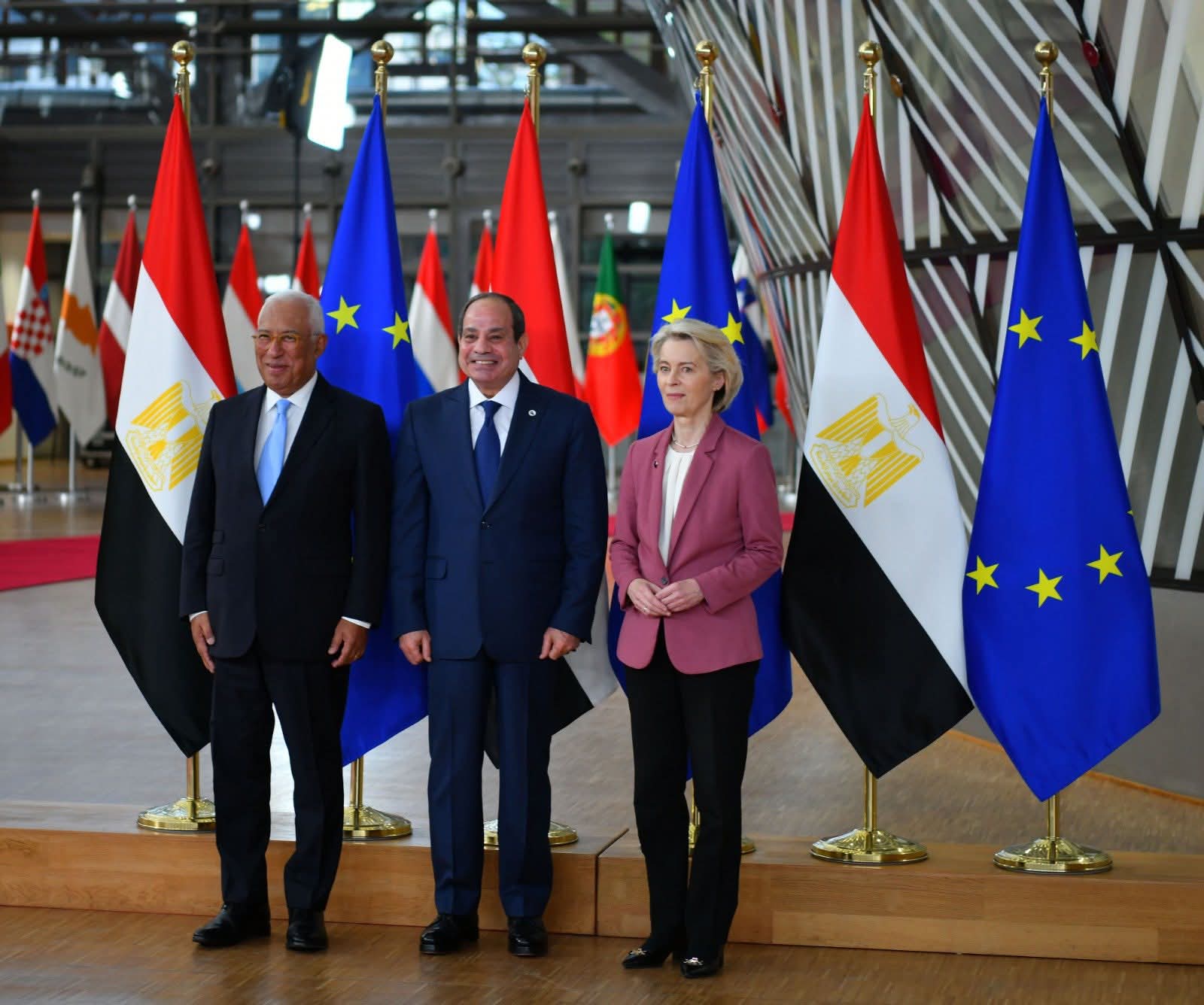 حيث التُقطت صور تذكارية بهذه المناسبة، أعقبها لقاء ثنائي بين السيد الرئيس والمسؤولين الأوروبيين، بحضور وزير الخارجية المصري، تلاه توقيع عدد من الاتفاقيات المشتركة.