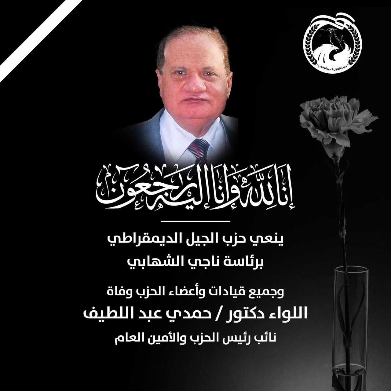 ينعى ناجى الشهابي، رئيس حزب الجيل الديمقراطي، بقلوب مؤمنة بقضاء الله وقدره، أخاه ورفيق دربه ورفيق مشوار تأسيس حزب الجيل الديمقراطي، اللواء طبيب حمدي عبد اللطيف، أحد أبطال حرب أكتوبر المجيدة، والنائب الأول لرئيس حزب الجيل، وأمينه العام، الذي وافته المنية اليوم بعد صراع طويل مع المرض، تمكن منه أخيرًا، وصعدت روحه الطاهرة إلى بارئها راضية مرضية بإذن الله.