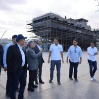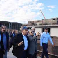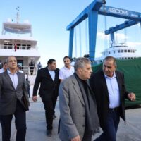 بدأت الجولة بتفقد أعمال بناء القاطرات البحرية من طراز” عزم” بساحة الترسانة، حيث يجري العمل حالياً لاستكمال أعمال بناء 8 قاطرات يتم بناؤهم على التوازي وذلك بعد تسليم القاطرتين “عزم 1″ و”عزم 2” .