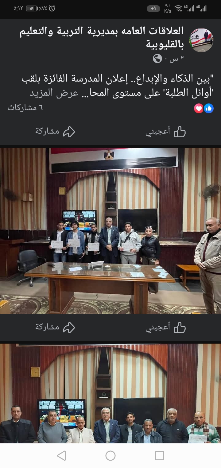 والمركز الرابع: مدرسة طحا نوب الثانوية – إدارة شبين القناطر التعليمية.