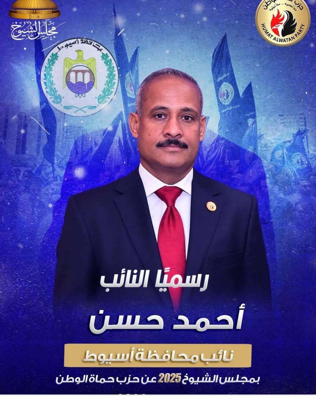 النائب أحمد محمدحسن إبن قريةكوم المنصورة بمركز أبنوب وأحد قيادات حزب حماة الوطن بأسيوط الذين تم إختيارهم وترشيحهم فى القائمة الوطنية لدوره الفعال وشعبيته الجارفة