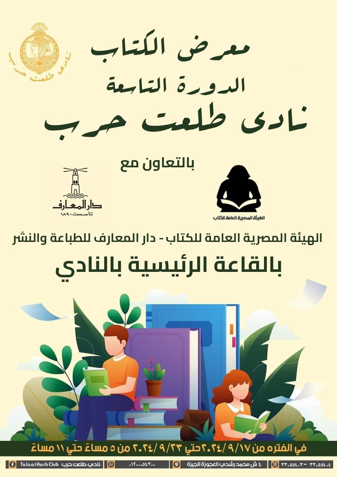 تنطلق فعاليات معرض الكتاب فى دورته التاسعة ، الذى ينظمه نادى طلعت حرب بالتعاون مع الهيئة المصرية العامة للكتاب، ودار المعارف للنشر والتوزيع وبمشاركة الجمعية المصرية للكاريكاتير فى الخامسة من مساء اليوم الثلاثاء 17 سبتمبر الحالى، بمقر النادى بالعجوزة