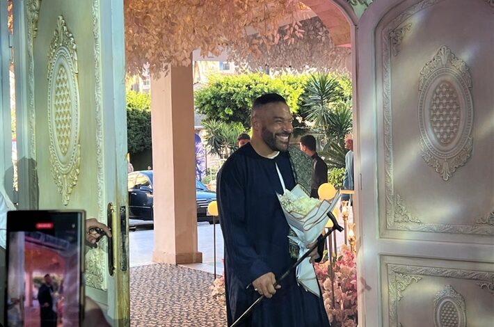 ظهر محمد خميس خلال حفل الزفاف ممسكًا بعكاز وباقة من الورود أهداها لعروسه، وسط أجواء عائلية دافئة، غلب عليها الطابع التراثي والبساطة.