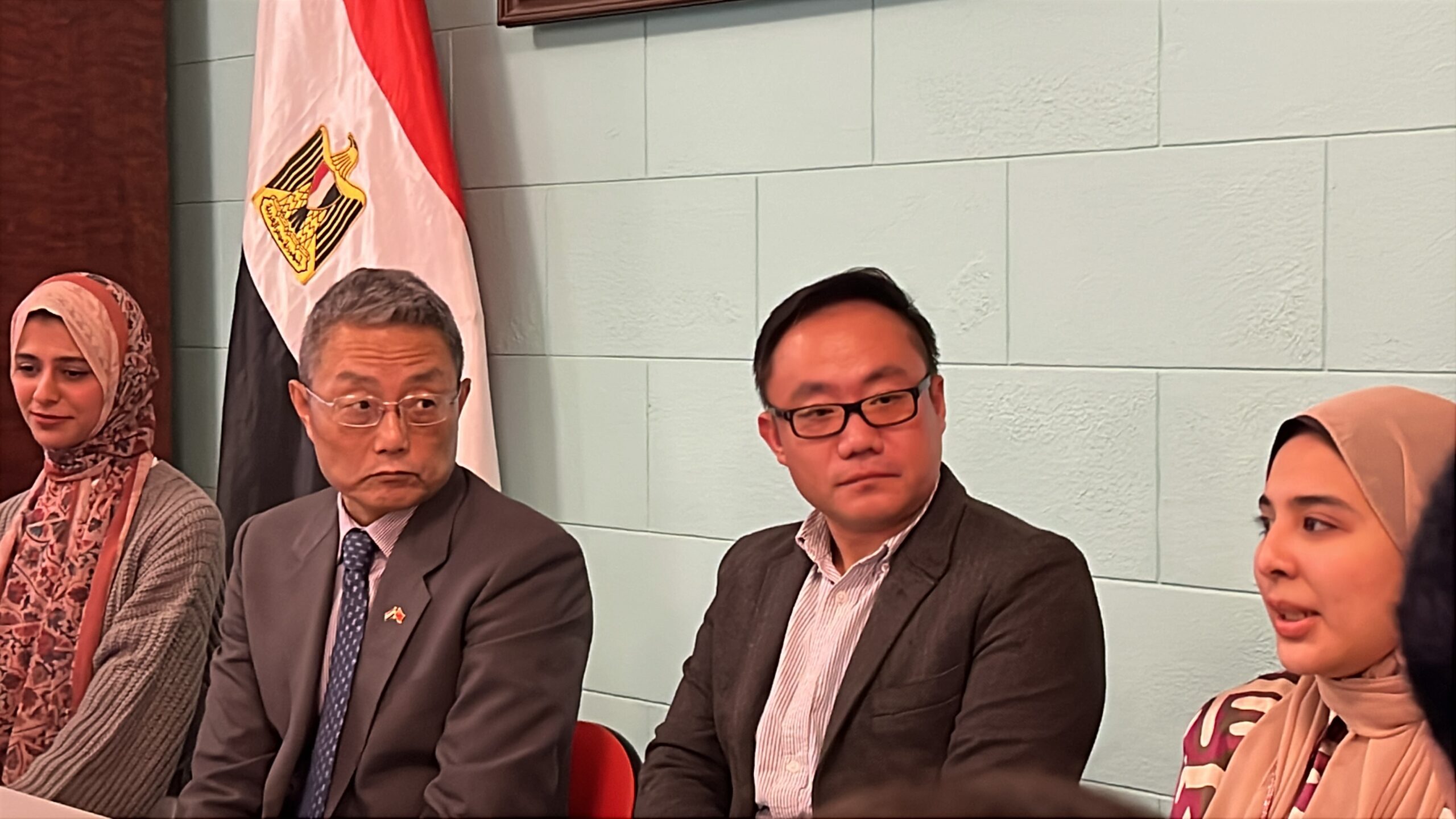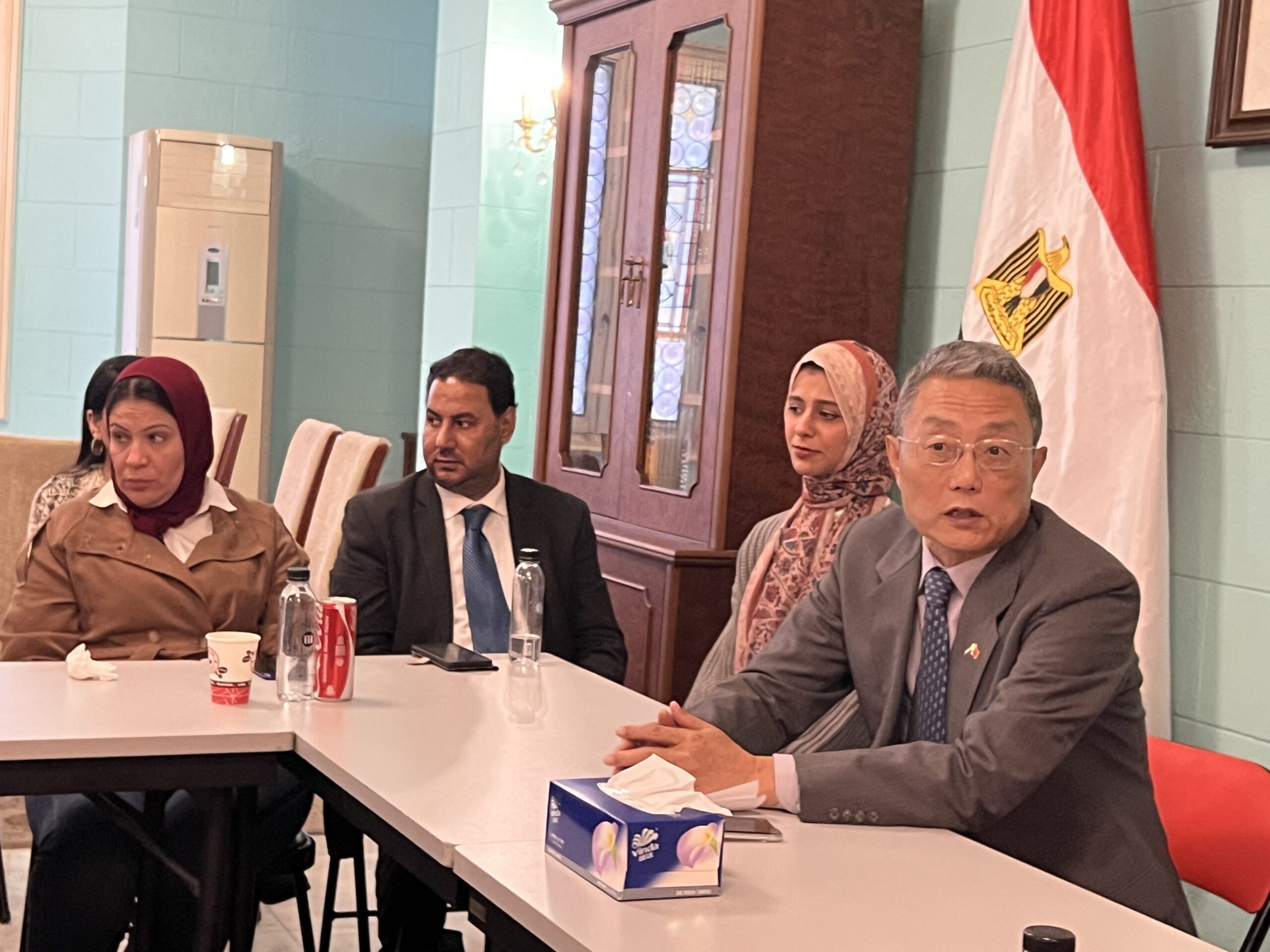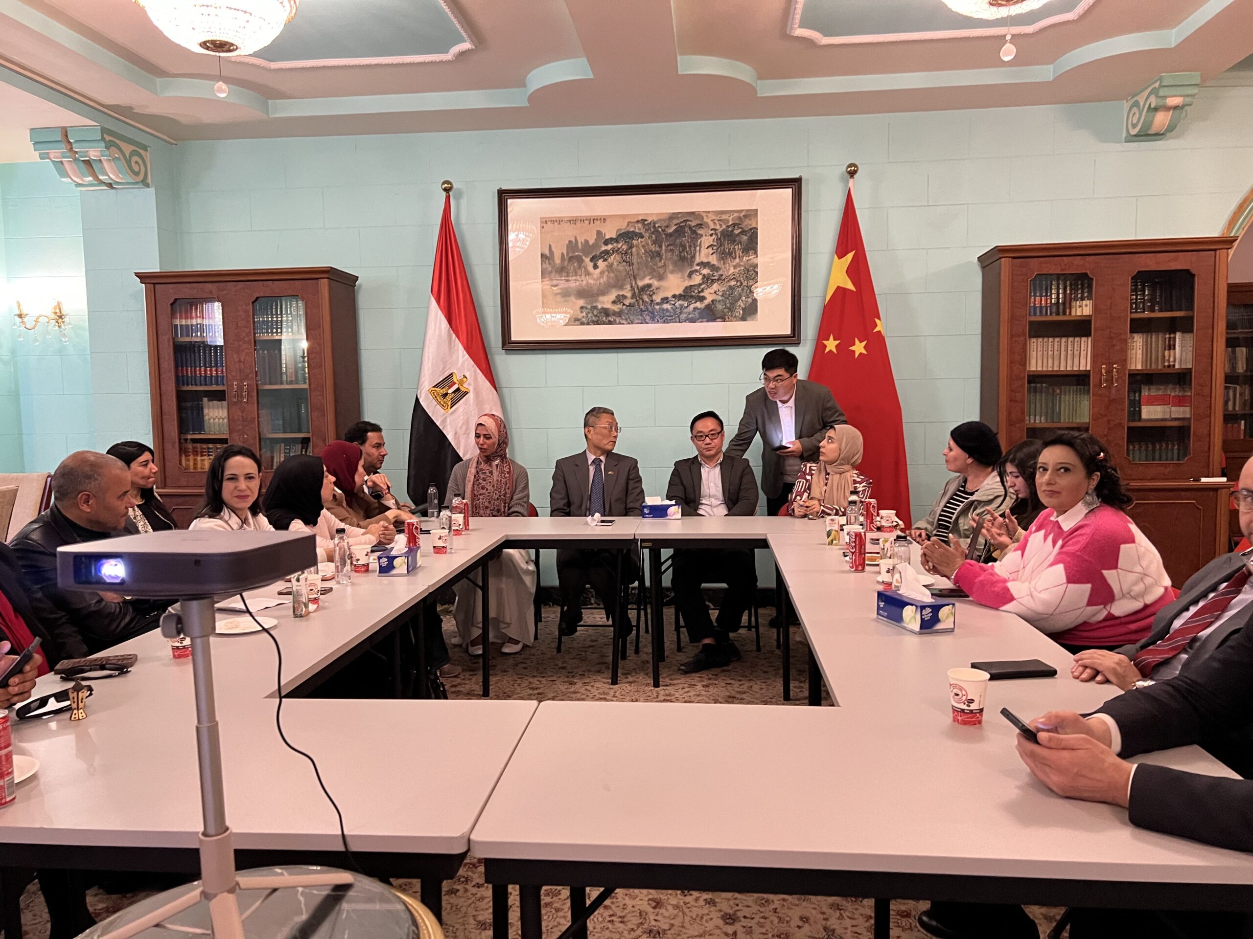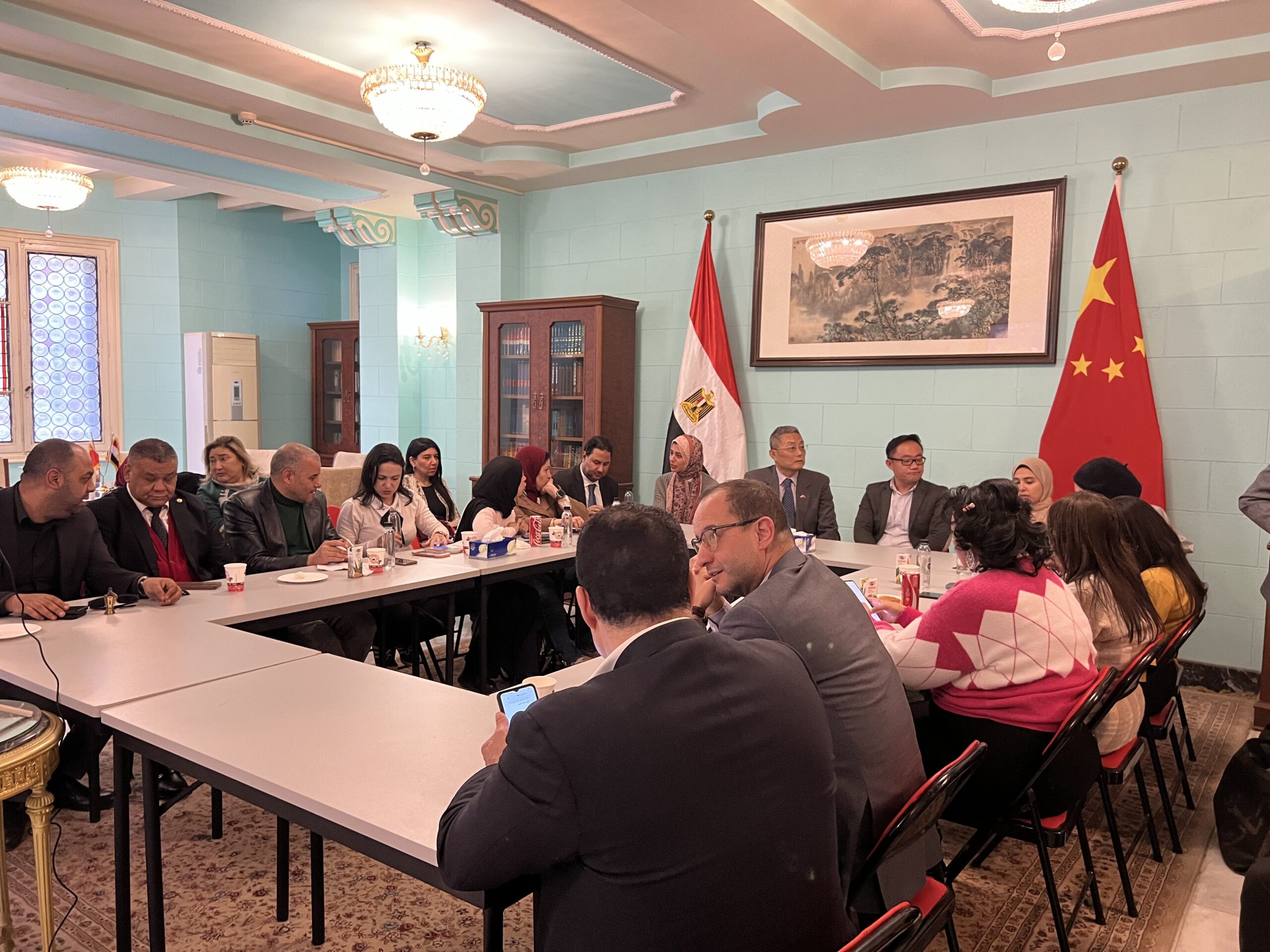 بحضور يانغ يي، قنصل عام الصين بالإسكندرية، وعدد من ممثلي الشركات الصينية العاملة في مصر، من بينهم مسئول الشركة الصينية العامة للإنشاءات المنفذة لمشروعات بالعلمين الجديدة والعاصمة الإدارية.