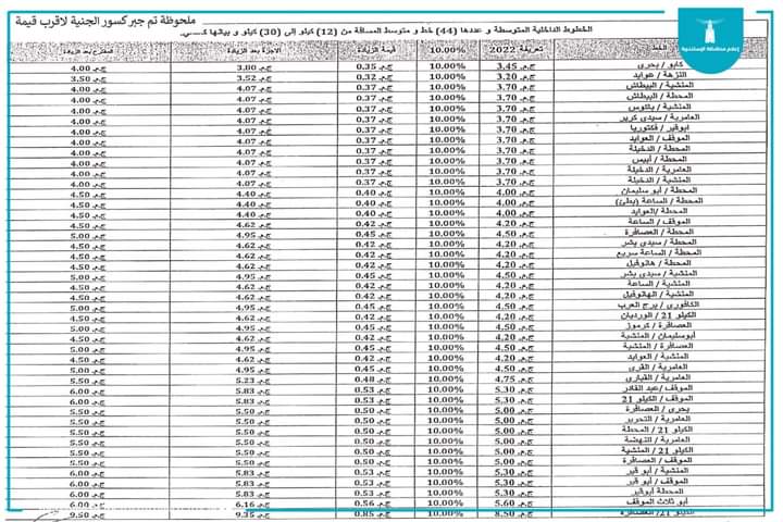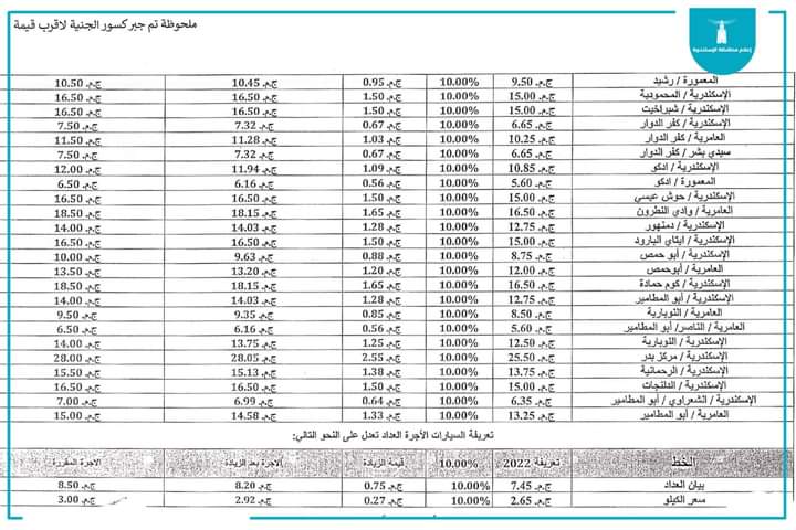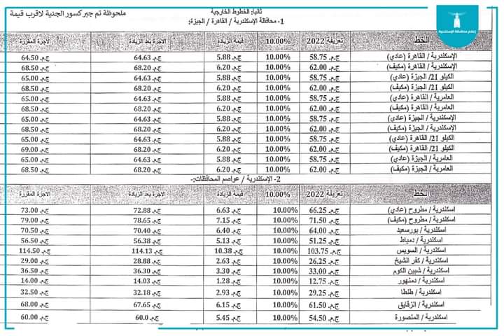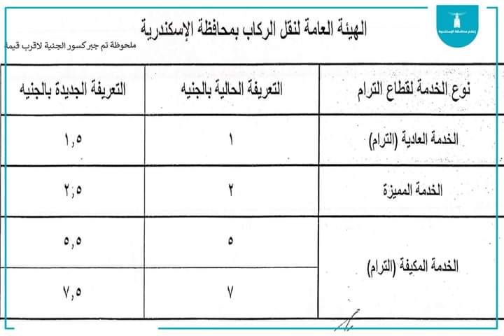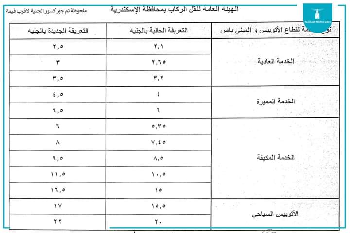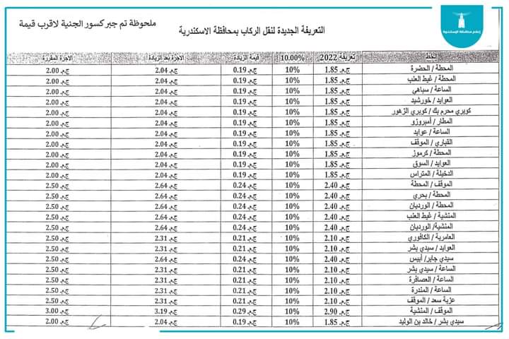 ووجه محافظ الإسكندرية إدارة مشروع محطات الركاب والانتظار، بالإلتزام بنشر التعريفة الجديدة بالمواقف والمحطات المختلفة وتعليقها فى مكان ظاهر. وإلزام سائق النقل بعمل ملصقات بالتعريفة الجديدة لكل خط سير .