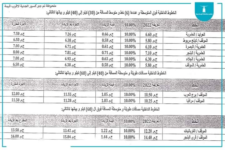 مشيرا إلى أن النسبة لأوتوبيسات وسيارات ووسائل النقل العام فإن الزيادة المقررة لا تتعدى نسبة 10%، على أن يتم إعلان التعريفات الجديدة وتعليقها بكافة المواقف و بصورة واضحة.