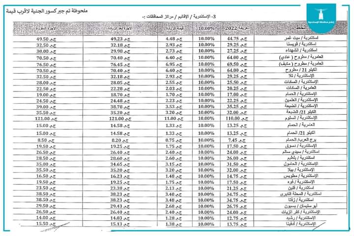 اعتمد محافظ الاسكندريه التعريفة الجديدة لسيارات الاجرة لوسائل النقل الداخلية والخارجية وذالك النقل العام بالمحافظة والمقدمة من مشروع محطات الركاب والانتظار ويتم تطبيقها بدء من تاريخ الاعتماد طبقا للجداول المرفقة،