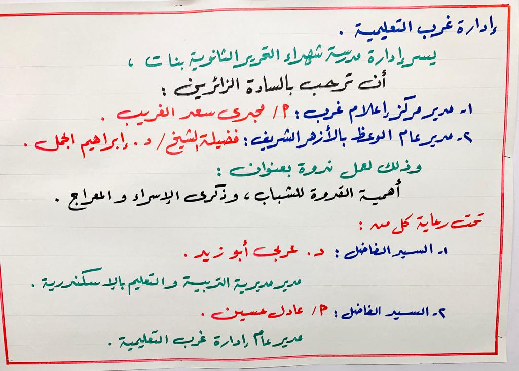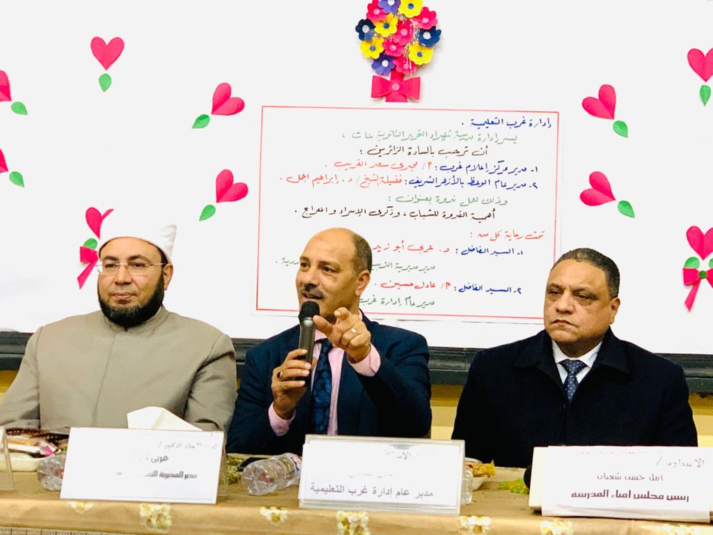 افتتح الدكتور عربي أبوزيد مدير مديرية التربية والتعليم صباح اليوم الإثنين الموافق 20 من فبراير 2023 ندوة القدوة الحسنة والاحتفال بليلة الإسراء والمعراج بمدرسة شهداء التحرير الثانوية بنات بإدارة غرب ، وذلك بحضور الدكتور إبراهيم الجمل مدير عام الوعظ بالإسكندرية والأمين العام لبيت العائلة المصرية وعادل حسين مدير عام إدارة غرب والأستاذ مجدي الغريب مدير عام مركز إعلام غرب بالإسكندرية والأستاذة أمل حسن رئيس مجلس أمناء المدرسة .