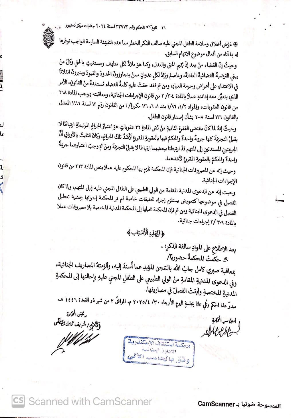 وحكمت المحكمة حضوريًا بمعاقبة صبري كامل جاب الله بالسجن المؤبد عمّا أسند إليه، وألزمته المصاريف الجنائية، وفي الدعوى المدنيّة المُقامة من الولي الطبيعي على الطفل المجني عليه بإحالتها إلى المحكمة المدنية المختصة وأبقت الفصل في مصاريفها