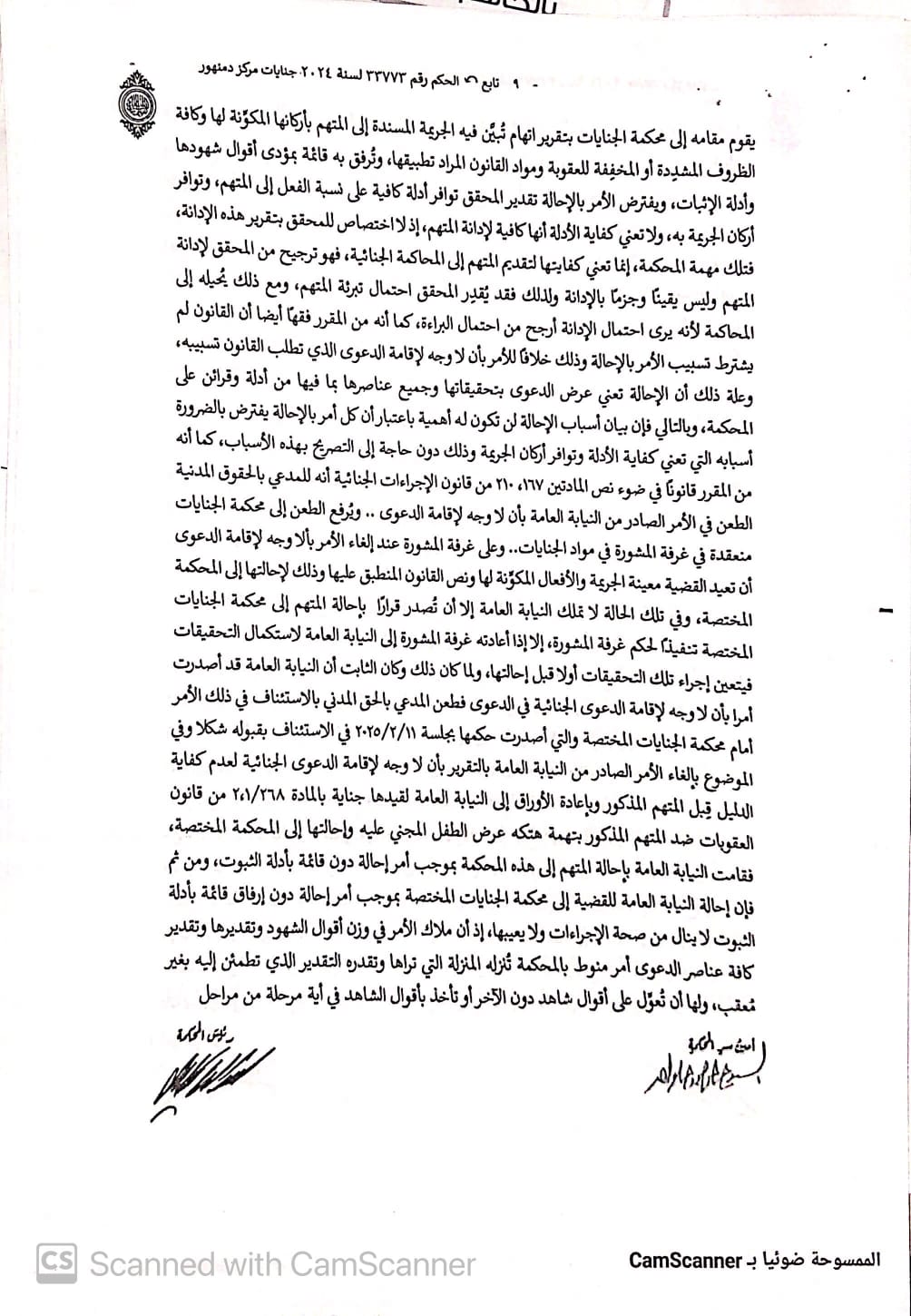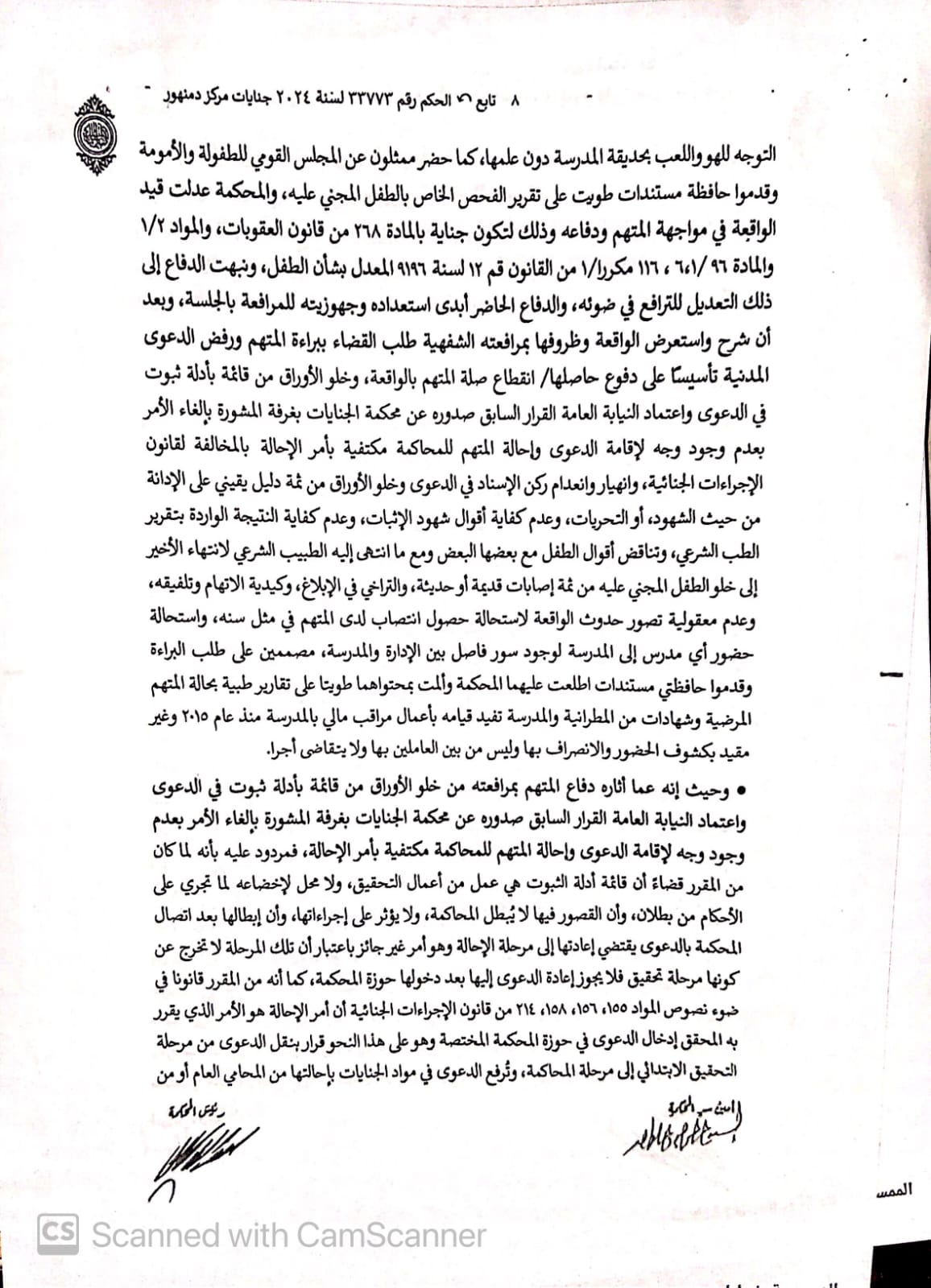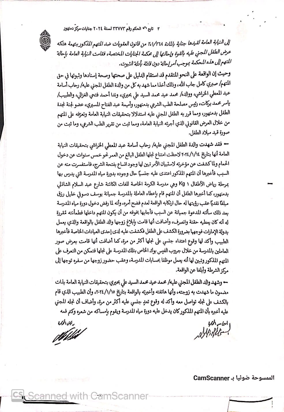 حيث أودعت الدائرة الأولى جنايات دمنهور، حيثيات حكمها في القضية 33773 لسنة 2024 جنايات مركز دمنهور ضد المتهم “ص.ك، بهتك عرض طفل دمنهور، الذي تتهم أسرته موظفًا في مدرسته بمحافظة البحيرة بهتك عرضه، وصدر حكم (أول درجة) ضد المتهم بالسجن المؤبد.