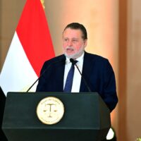 والسيد/ حسن عبد الله، محافظ البنك المركزي المصري، والسيد/ أحمد كجوك، وزير المالية، بحضور السيد المستشار/ عدنان فنجري، وزير العدل.