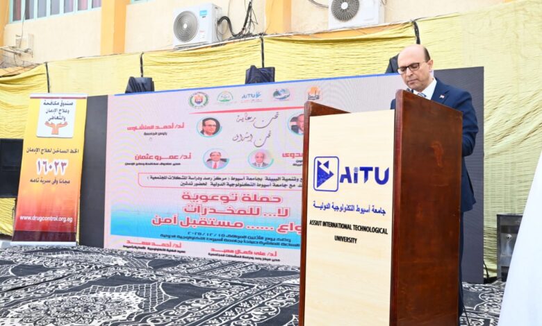 دشّن الدكتور أحمد المنشاوي، رئيس جامعة أسيوط والمشرف على جامعة أسيوط التكنولوجية الدولية، حملة توعية الشباب بمخاطر تعاطي المخدرات، التي ينظمها مركز رصد ودراسة المشكلات المجتمعية بقطاع خدمة المجتمع وتنمية البيئة، بالتعاون مع جامعة أسيوط التكنولوجية الدولية، تحت شعار «لا للمخدرات.. جيل واعٍ.. مستقبل آمن»، وذلك بمقر الجامعة التكنولوجية الدولية.