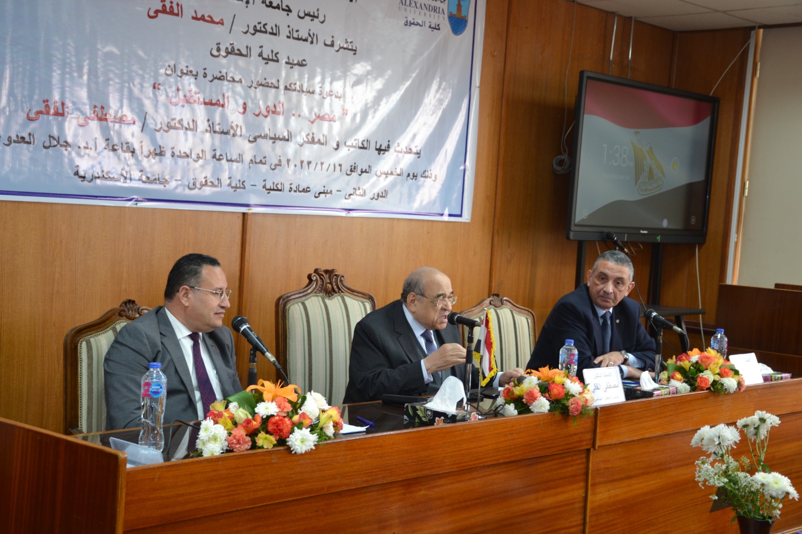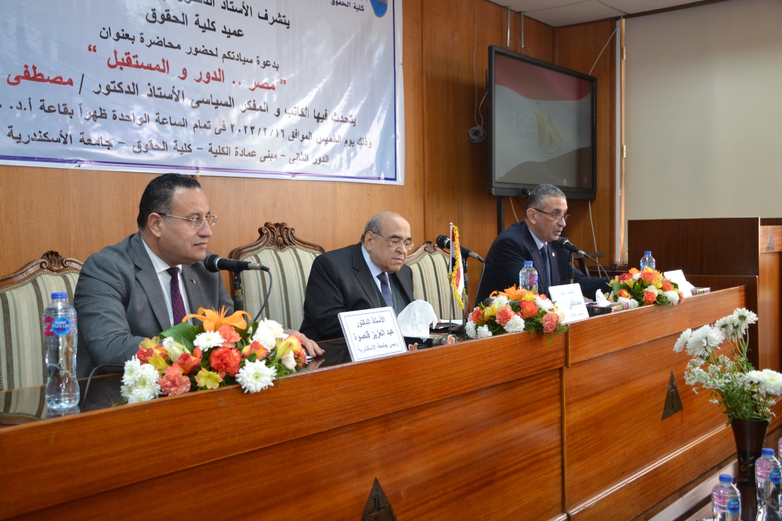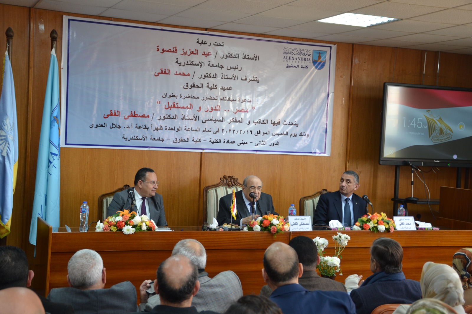 تحدث خلالها الدكتور مصطفى الفقى الكاتب والمفكر والسياسي البارز ورئيس مكتبة الإسكندرية السابق، عن دور مصر والمستقبل في القضايا المعاصرة ورؤيته للمستقبل وذلك بحضور الدكتور محمد الفقى عميد كلية الحقوق، والدكتور محمد عبد اللاه رئيس جامعة الإسكندرية الأسبق، والدكتورة هند حنفى رئيس جامعة الإسكندرية الأسبق، وعمداء ووكلاء الكليات وأعضاء مجلسى النواب والشيوخ ولفيف من أساتذة الفكر والثقافة بالمجتمع السكندرى.