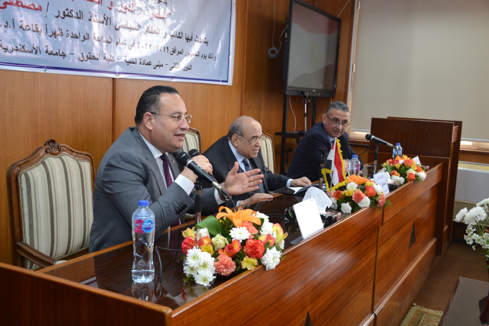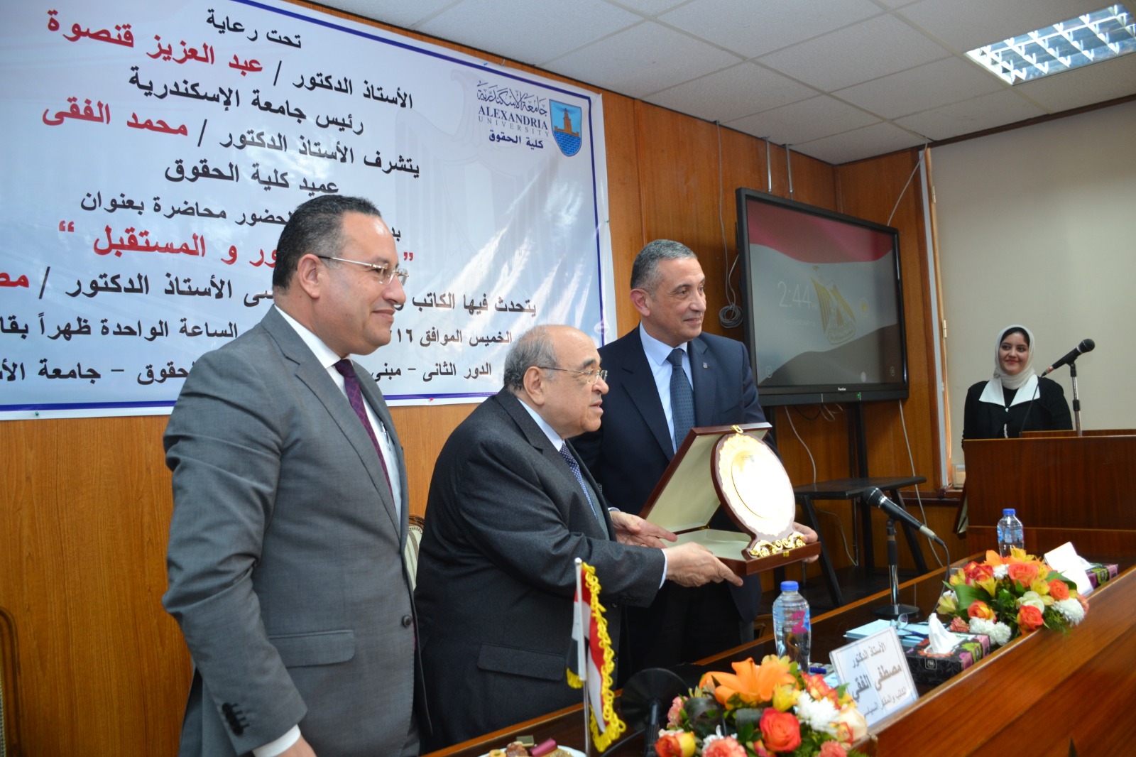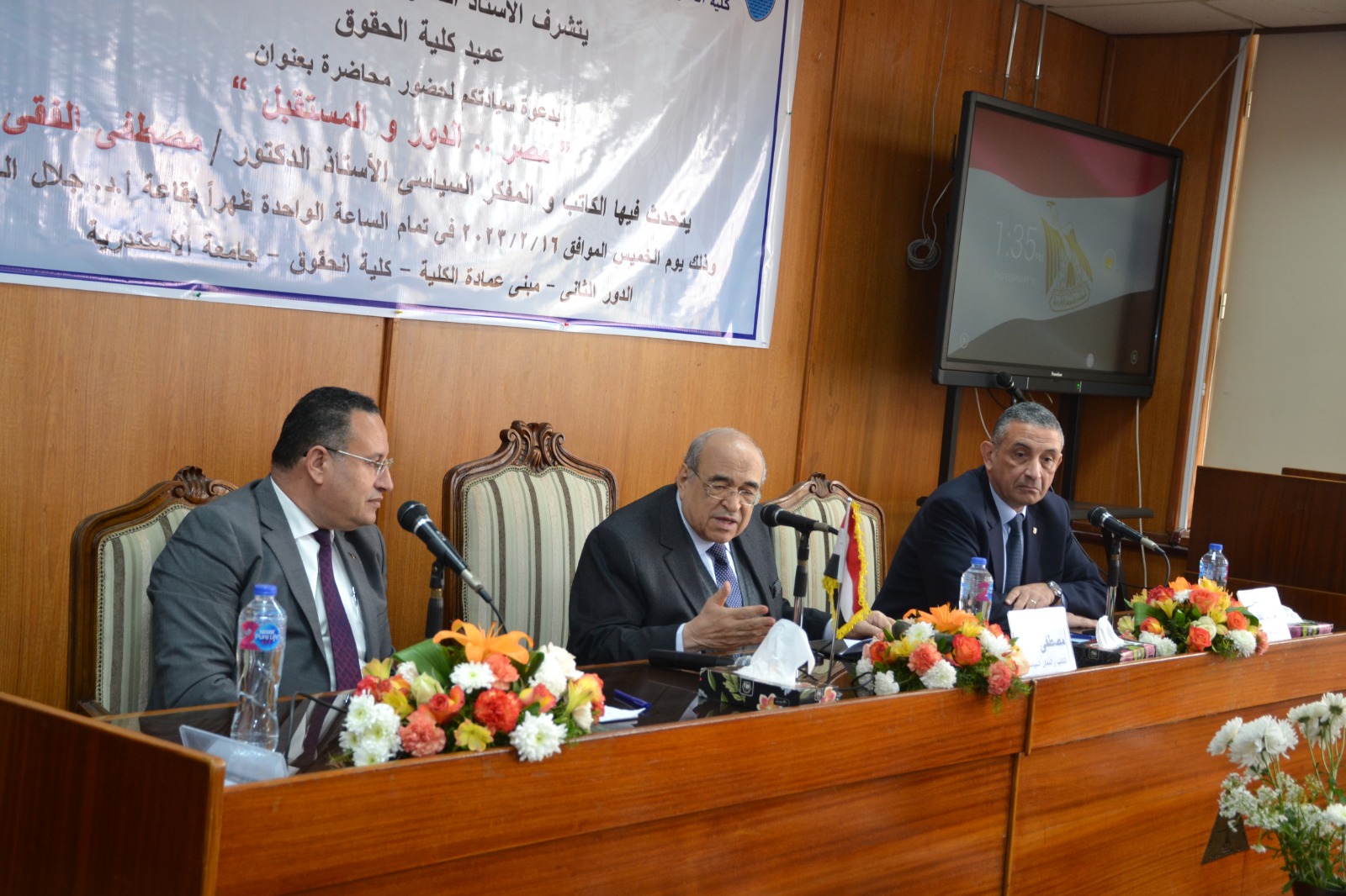 تحدث خلالها الدكتور مصطفى الفقى الكاتب والمفكر والسياسي البارز ورئيس مكتبة الإسكندرية السابق، عن دور مصر والمستقبل في القضايا المعاصرة ورؤيته للمستقبل وذلك بحضور الدكتور محمد الفقى عميد كلية الحقوق، والدكتور محمد عبد اللاه رئيس جامعة الإسكندرية الأسبق، والدكتورة هند حنفى رئيس جامعة الإسكندرية الأسبق، وعمداء ووكلاء الكليات وأعضاء مجلسى النواب والشيوخ ولفيف من أساتذة الفكر والثقافة بالمجتمع السكندرى.
