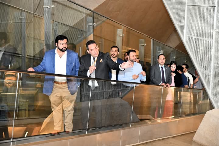 وكان في استقبالهم الدكتور أحمد غنيم الرئيس التنفيذي لهيئة المتحف المصري الكبير الذي اصطحبهم في جولة تَضَمَّنت الساحة الخارجية للمتحف، والبهو الرئيسي، والدَّرَج العظيم، وقاعات العرض الرئيسة.