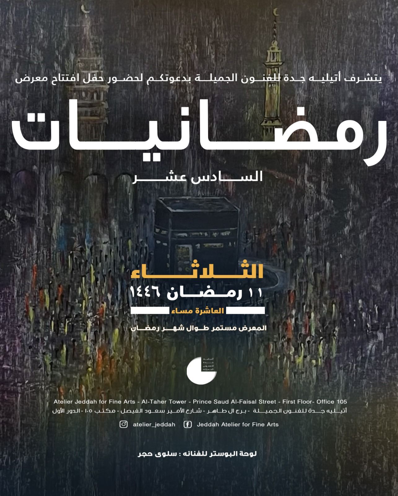 أفتتح أتيليه جدة للفنون الجميلة اليوم الثلاثاء 11 مارس 2025 معرض ” رمضانيات ” والذي أُقيم للعام السادس عشر على التوالي ويمثل المعرض تقليداً رمضانياً سنوياً،