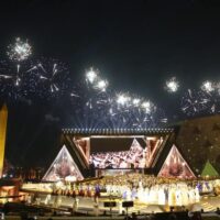 ليستمع الحضور لأغنية قبطية، وإنشاد صوفي، ثم عرض آخر بالدرونز يظهر عبارة “الحضارات تزدهر وقت السلام”.