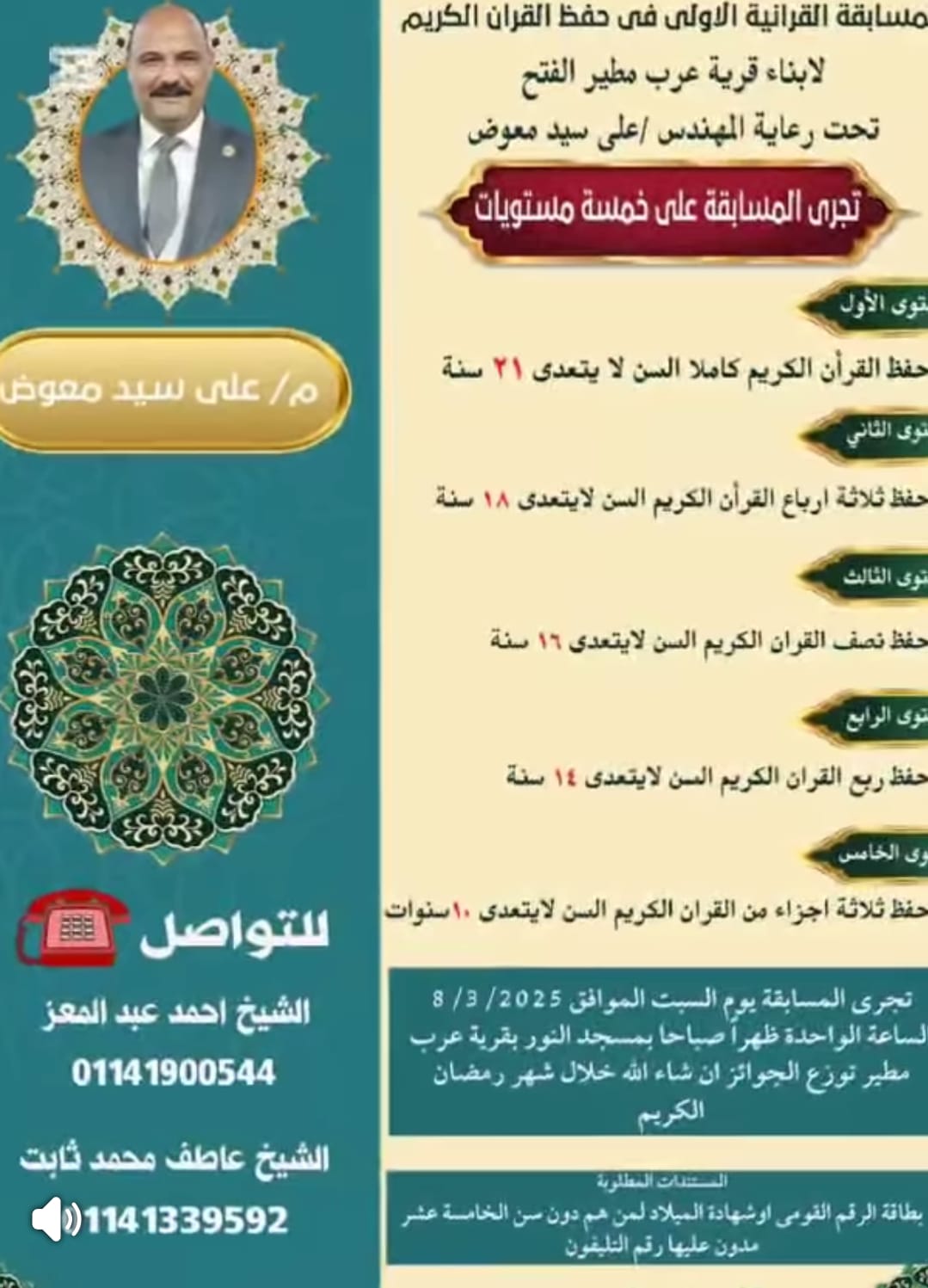 والتى أقامها لحفظة كتاب الله وشارك فيها ٤٧ متسابق وقام بتقديم جوائز مالية للحفظة لتشجيع البراعم والشباب على حفظ القرأن ويواصل على سيد أعماله الخيرية والخدمية مشاركا لأبناء وطنه في كافة مناسباتهم داعما لأوجه الخير ساعيا لقضاء حوائج الناس دون كلل أوملل