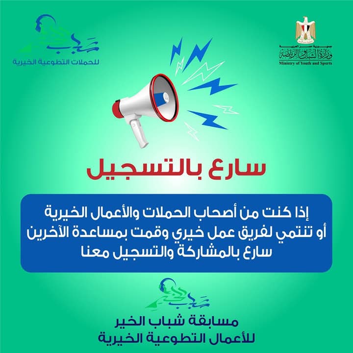 – لمزيد من المعلومات برجاء متابعة الصفحة الرسمية لوزارة الشباب والرياضة.