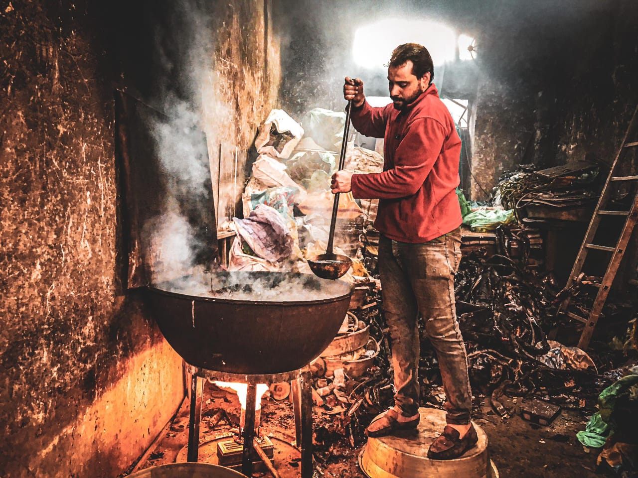 الصوره الأولي هي لصنايعي ورشة المسابك في الفراهدا وهي صناعة شاقة جدا وخطيرة ومرهقه وتحتاج قوة بدنية وتركيز عالي إصابتها صعبة للغاية تحتاج إلي المهارة