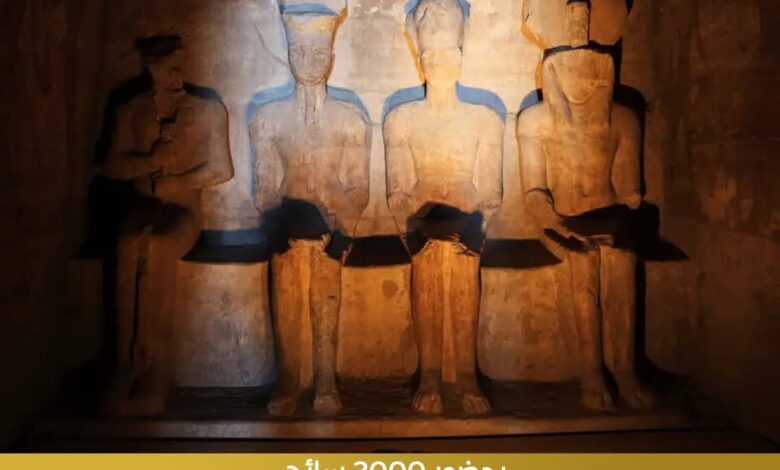 خلال تعامد شعاع الشمس على تمثال الملك رمسيس الثاني وتماثيل الآلهة (آمون ورع حور)