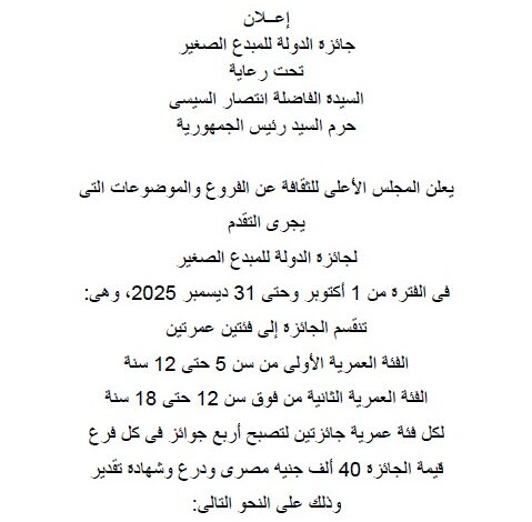 تُقام الجائزة تحت إشراف وزارة الثقافة والمجلس الأعلى للثقافة، على مستوى الجمهورية، للفئة العمرية من 5 حتى 18 عامًا، بما يسهم في تنمية الوعي الثقافي والإبداعي لدى الأطفال والشباب، ودعم مسارات الابتكار وبناء الإنسان.