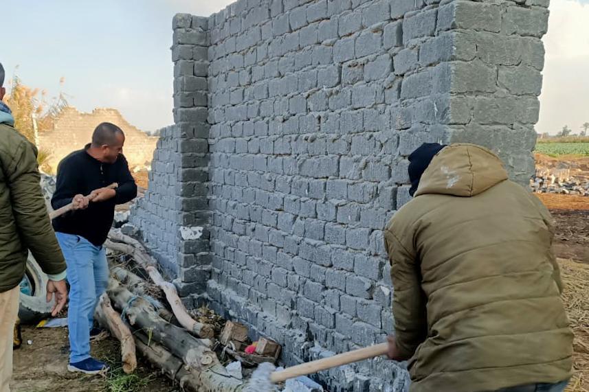 والتحفظ على كمية من حديد التسليح والأخشاب وكذا إزالة حوائط وأعمدة بقرية طيبة ١ منطقة النهضة علي مساحة ٦٠٠ م٢ تقريباً وكذا إزالة فورية لأعمال بناء مخالف عبارة عن أسوار بمسطح ٤٠٠٠م بقرية حارس ٣ وقرية البيضا