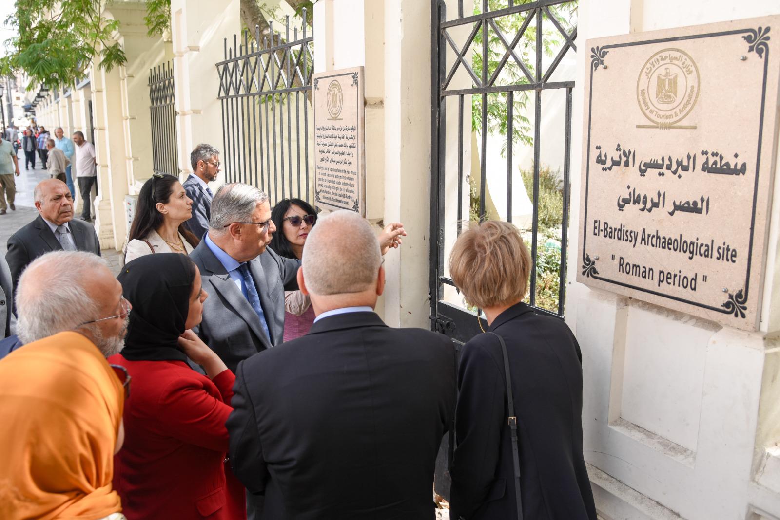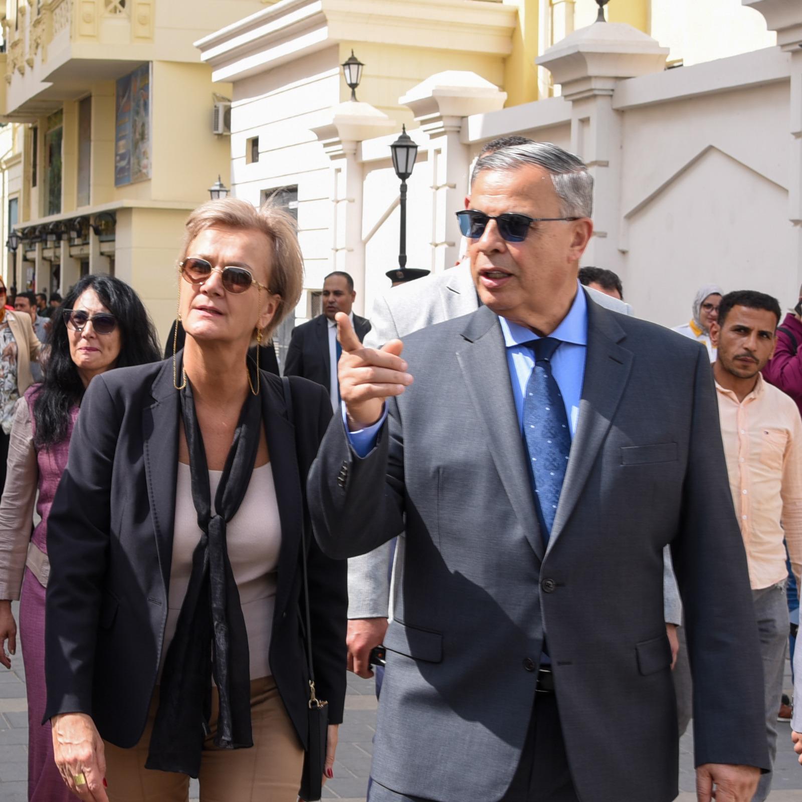 والوفد المرافق لها لتفقد أعمال تطوير وإحياء شارع النبي دانيال أحد أعرق الشوارع التراثية في نطاق حي وسط، وذلك في إطار الشراكة الاستراتيجية بين المحافظة والاتحاد الأوروبي لدعم المشروعات الثقافية والتنموية.