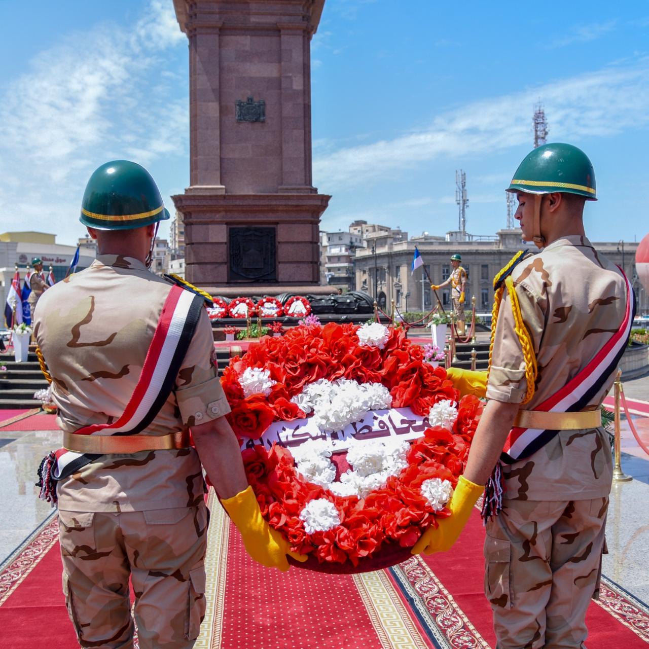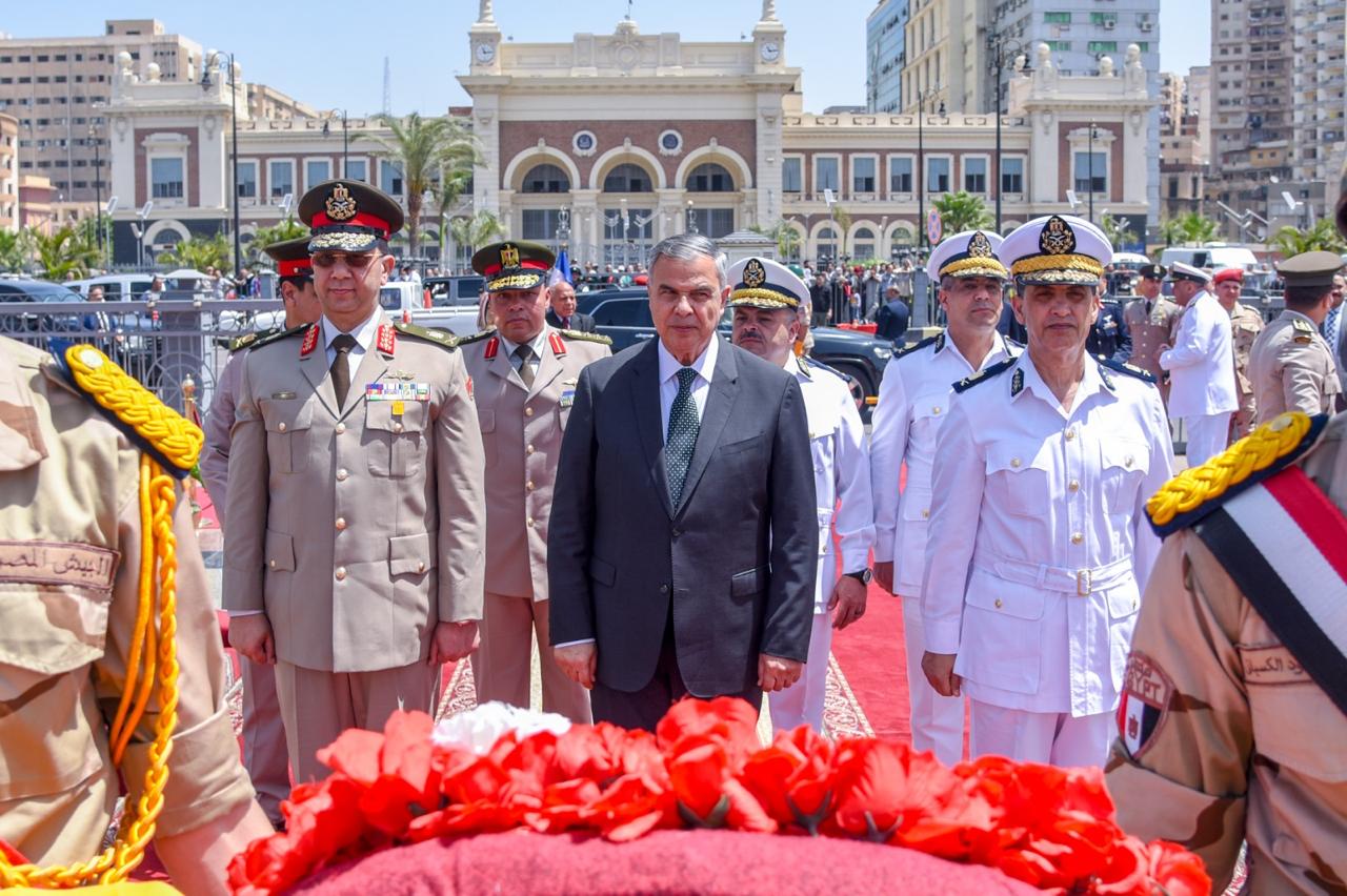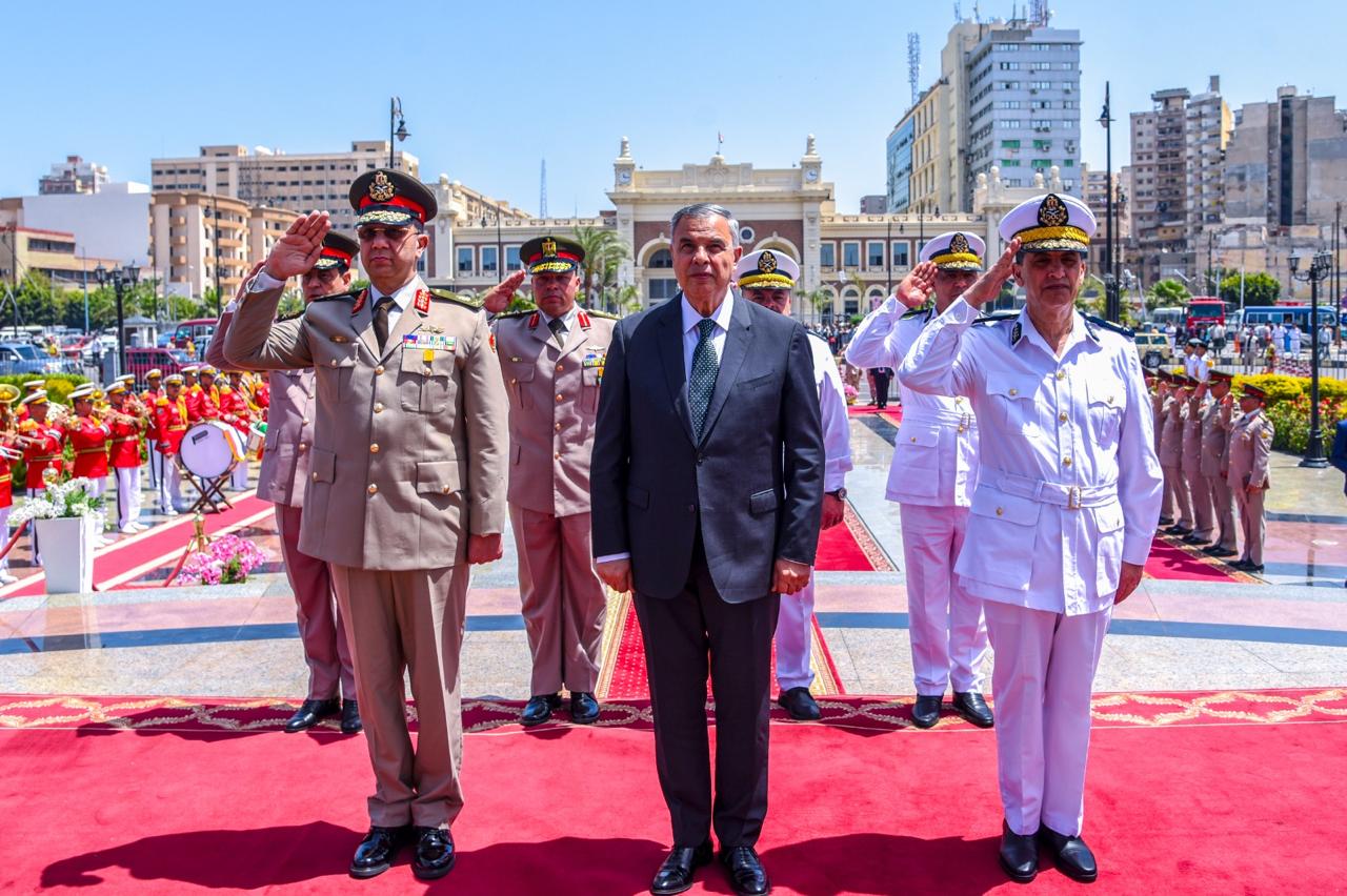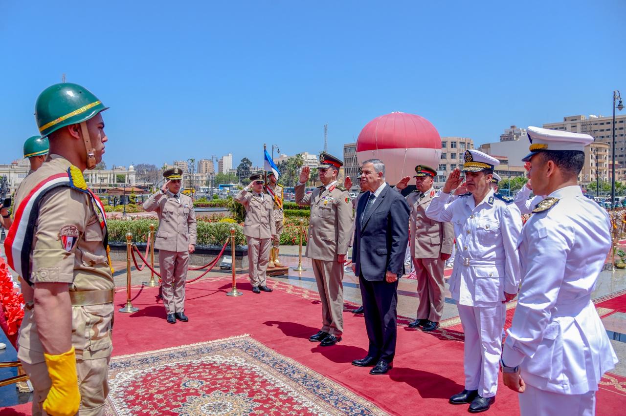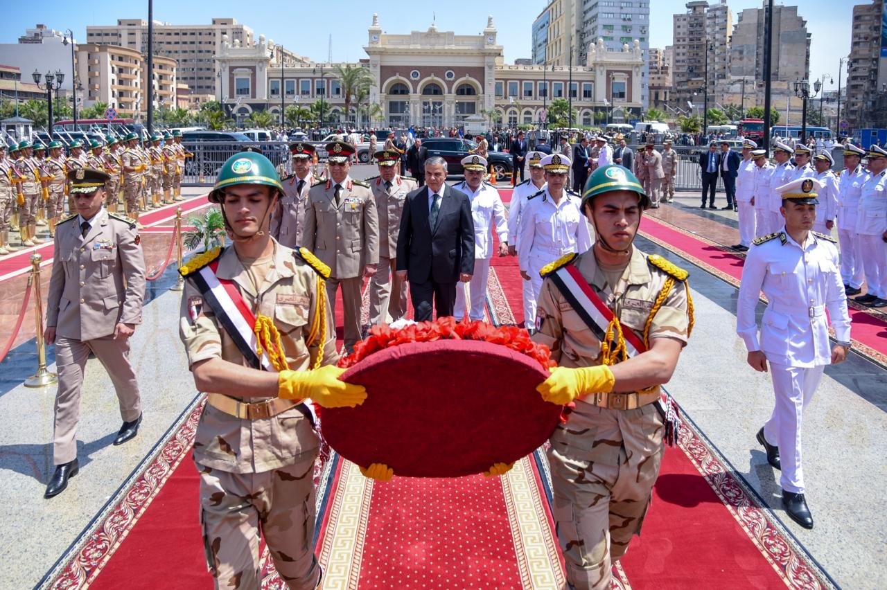 محافظ الإسكندرية وقائد المنطقة الشمالية يضعون أكليل الزهور على النصب التذكاري للشهداء