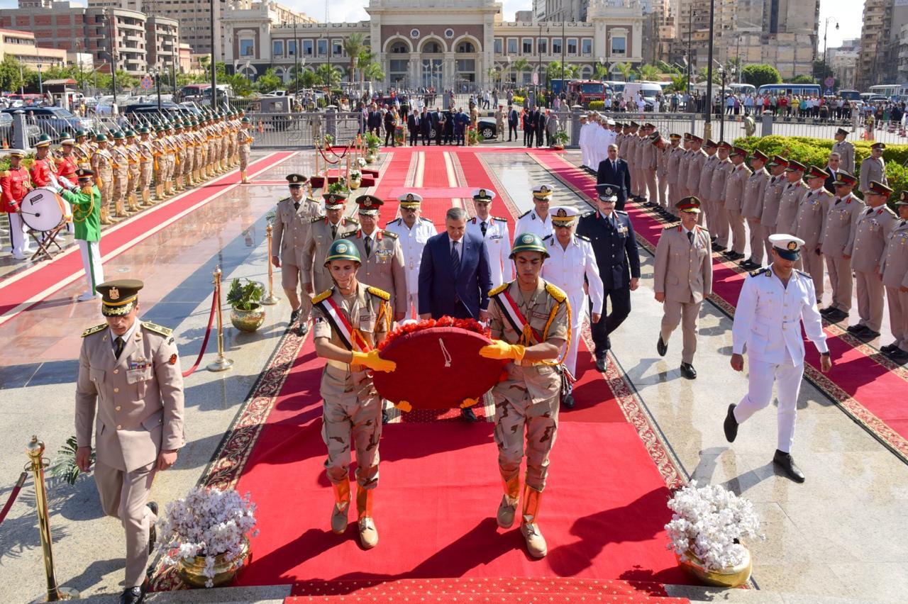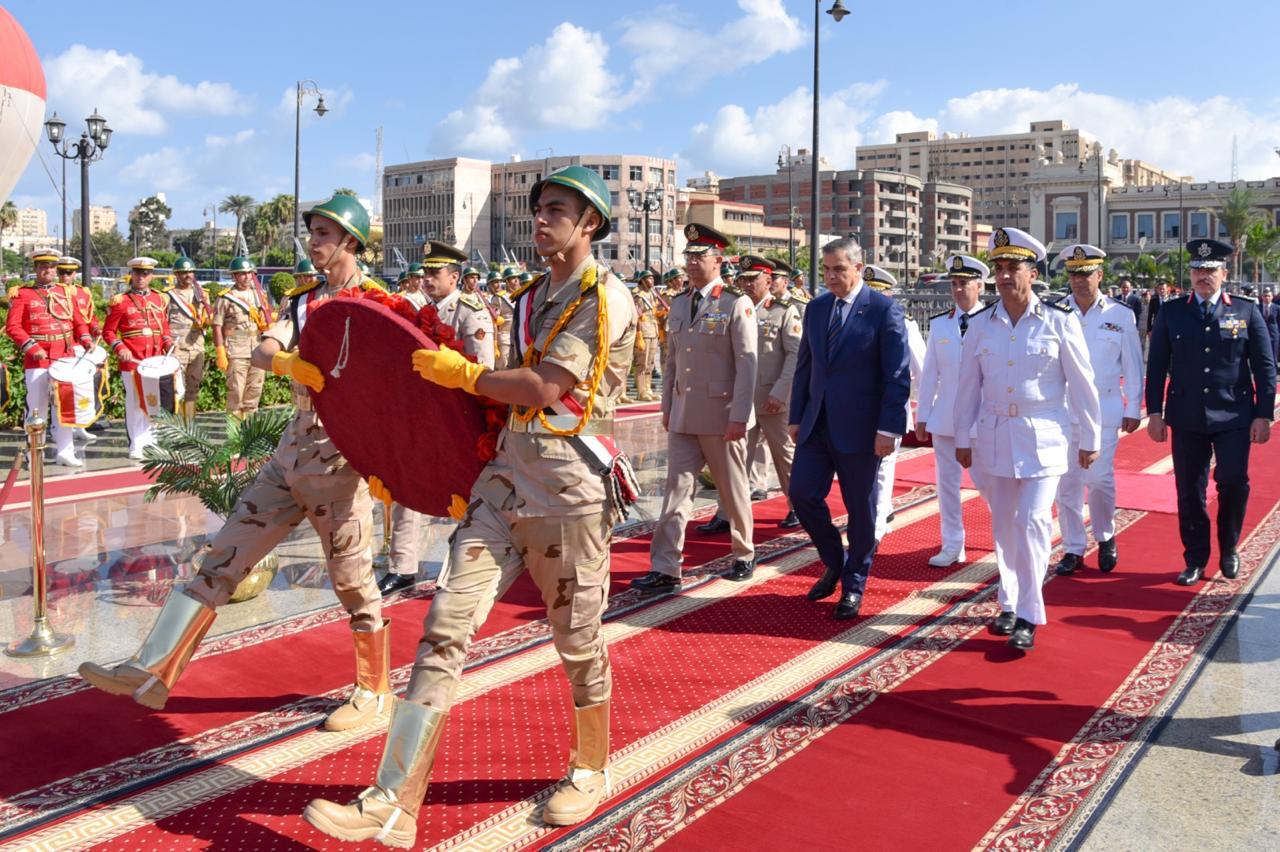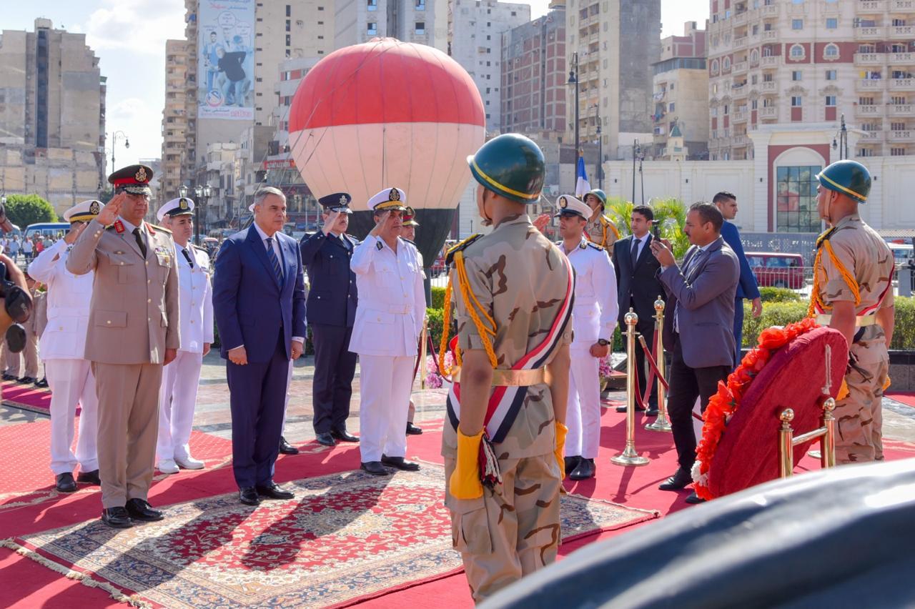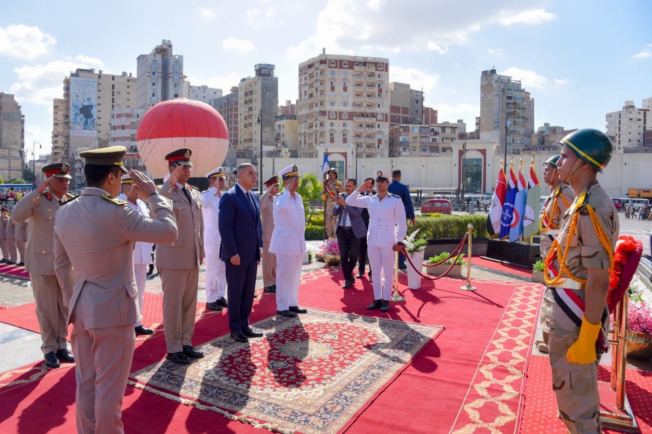 محافظ الإسكندرية وقائد المنطقة الشمالية ومدير أمن الإسكندرية يضعوا اكليلا ًمن الزهور على النصب التذكاري للشهداء