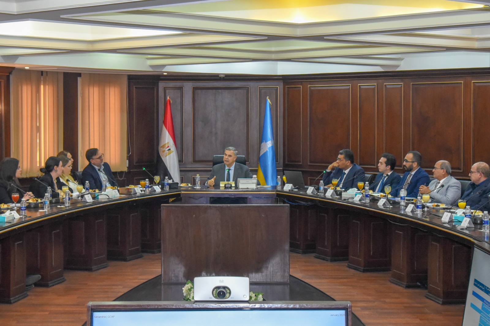 والوفد المرافق له، وممثلي وزارة التخطيط والتنمية الاقتصادية والتعاون الدولي، بالإضافة إلى عدد من الجهات والهيئات المعنية بمحافظة الإسكندرية، وذلك لحضور الاجتماع الختامي لخطة عمل المدن الخضراء بالإسكندرية.