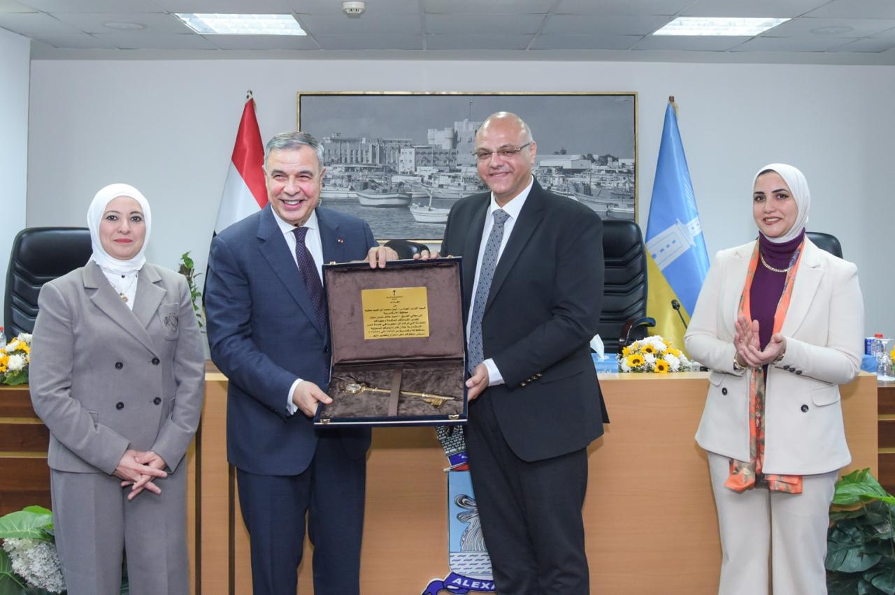 وفي ختام الحفل، قام محافظ الإسكندرية بتسليم «مفتاح المحافظة» للفريق/ أحمد خالد حسن سعيد المحافظ السابق،