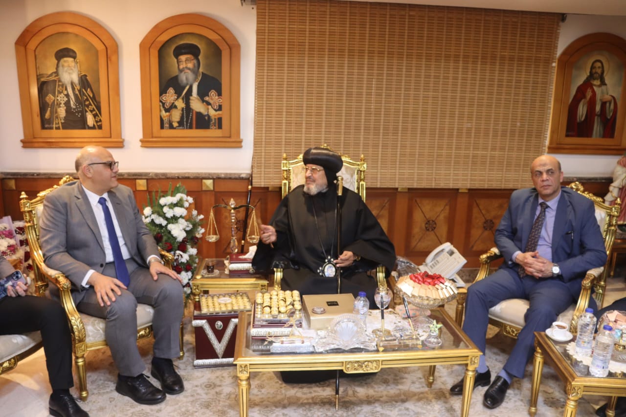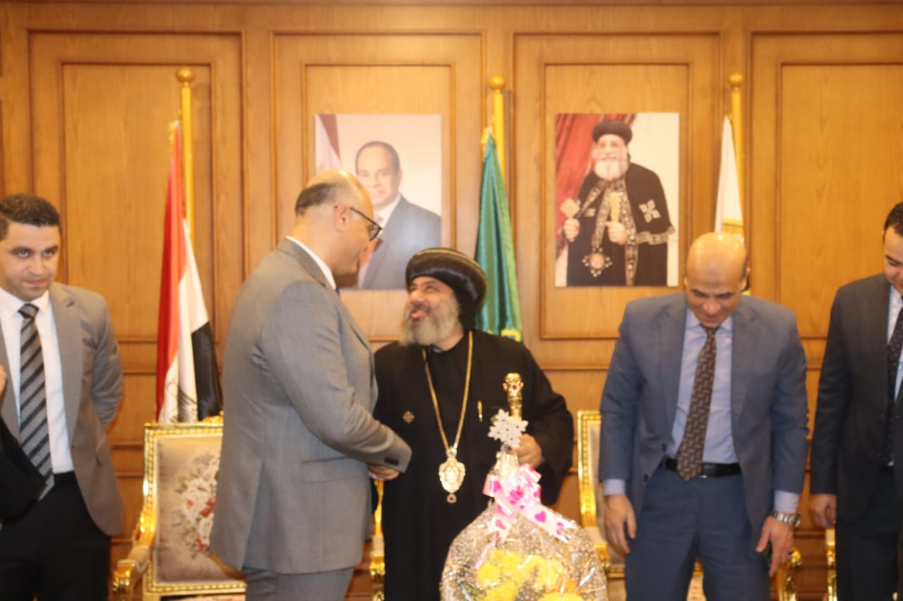 ثم توجه المحافظ لتقديم التهنئة للانبا نوفير اسقف شبين القناطر بمطرانية شبين القناطر بابو زعبل بالخانكة