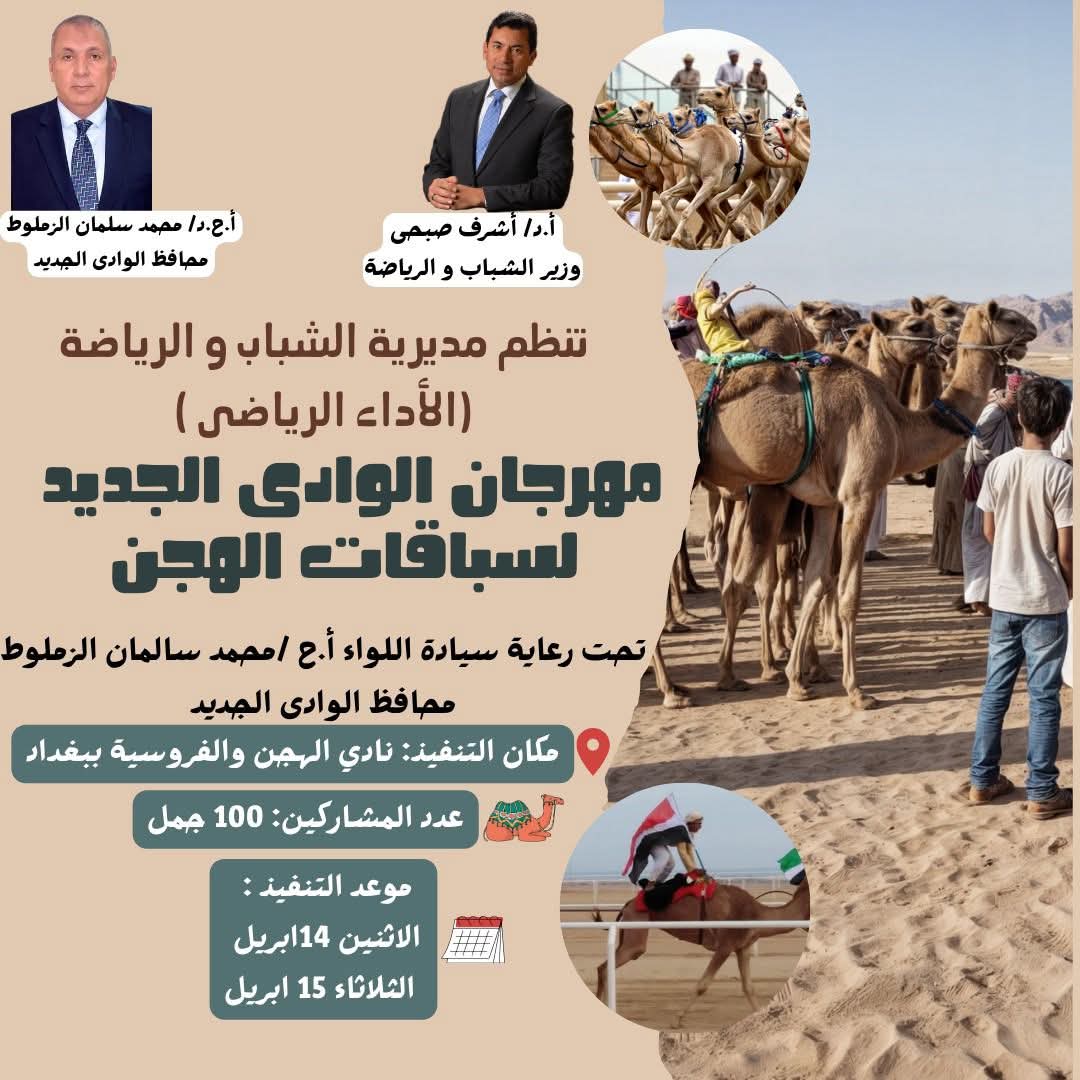 تستعد محافظة الوادي الجديد لإنطلاق فعاليات مهرجان سباقات الهجن، والذي تنظمه مديرية الشباب والرياضة (الأداء الرياضي)،