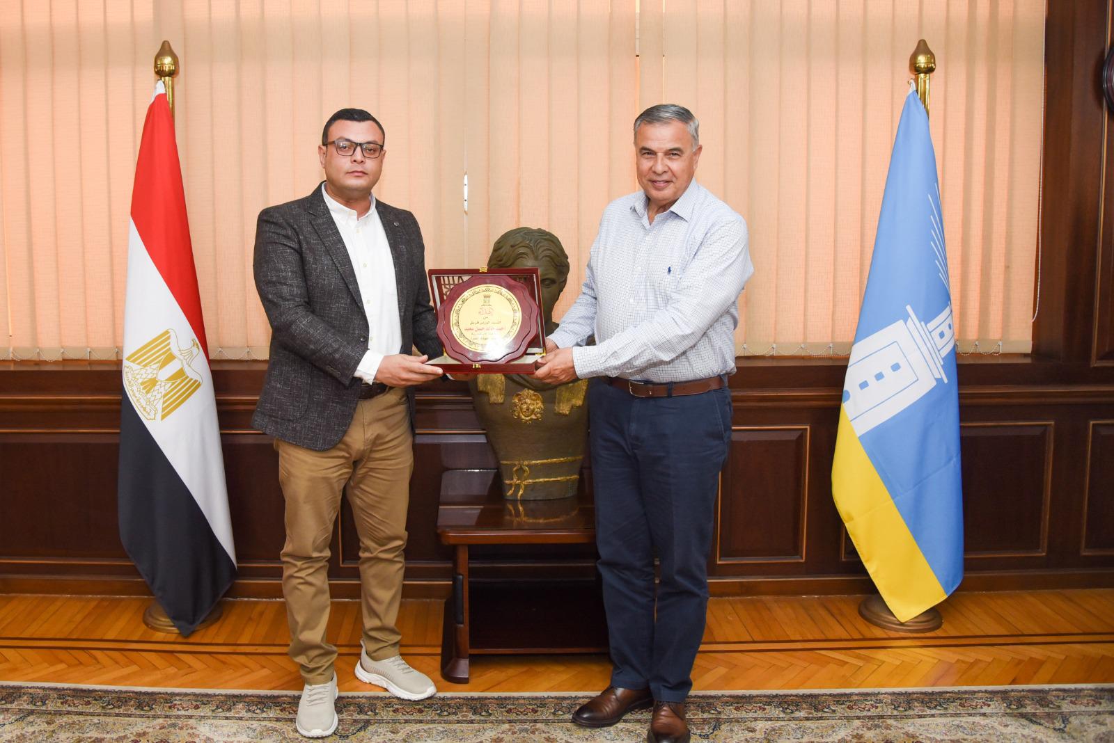 وفي ختام الاجتماع، أهدى الفريق احمد خالد حسن سعيد، درع المحافظة للمهندس شريف الشربيني، تكريما لدوره ومساهمته في النهوض بالقطاع العقاري، وجهوده في زيادة معدلات التنمية العمرانية.