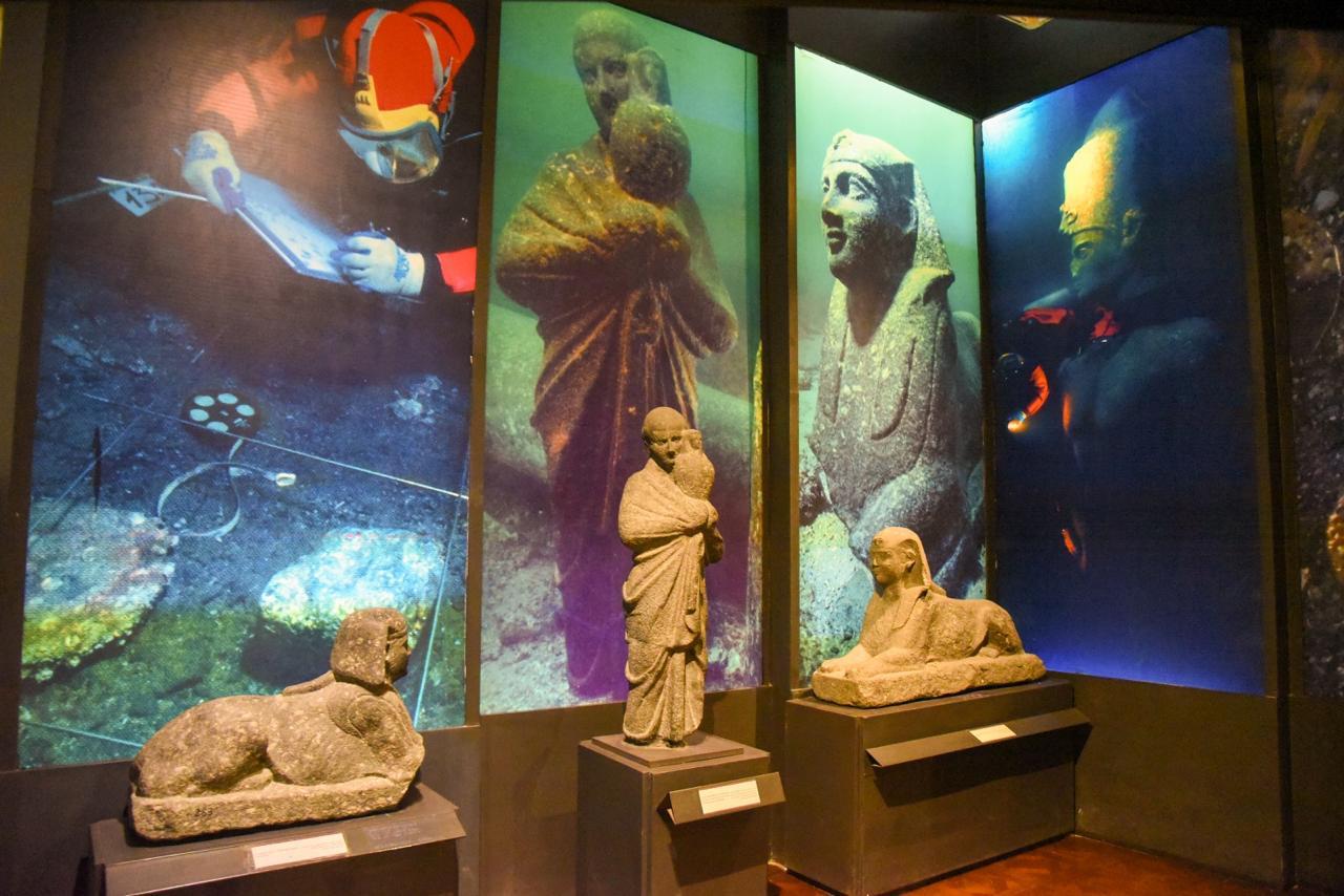 من مكتشفات مدينتي كانوب وهيراكليون بخليج أبي قير شرق مدينة الإسكندرية، لتعكس جوانب من الحياة اليومية والمعتقدات الدينية والطقوس الجنائزية في العصرين البطلمي والروماني.