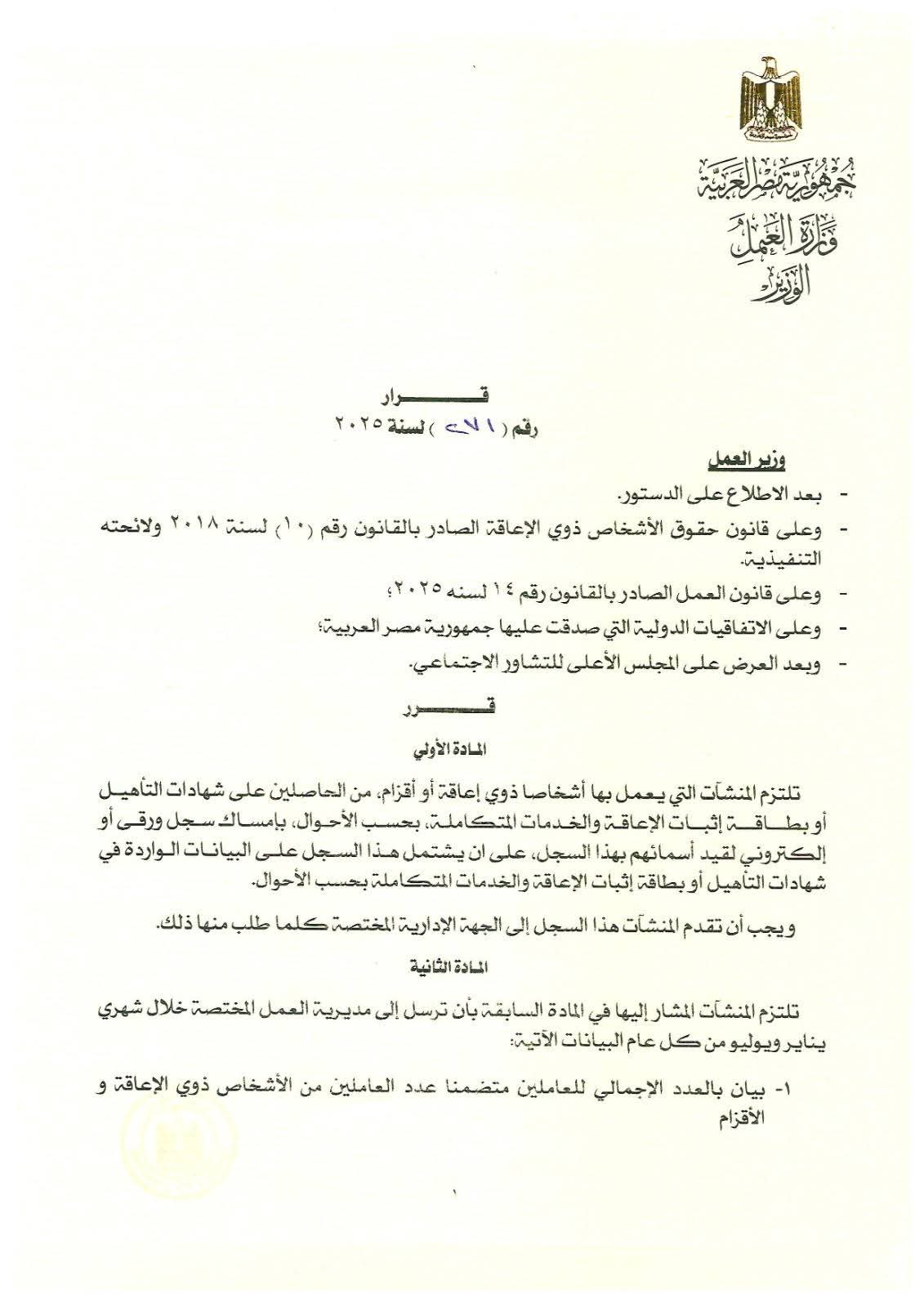 بعد الاطلاع على الدستور، وقانون حقوق الأشخاص ذوي الإعاقة رقم (10) لسنة 2018، وقانون العمل رقم (14) لسنة 2025، وبعد العرض على المجلس الأعلى للتشاور الاجتماعي..قرر..