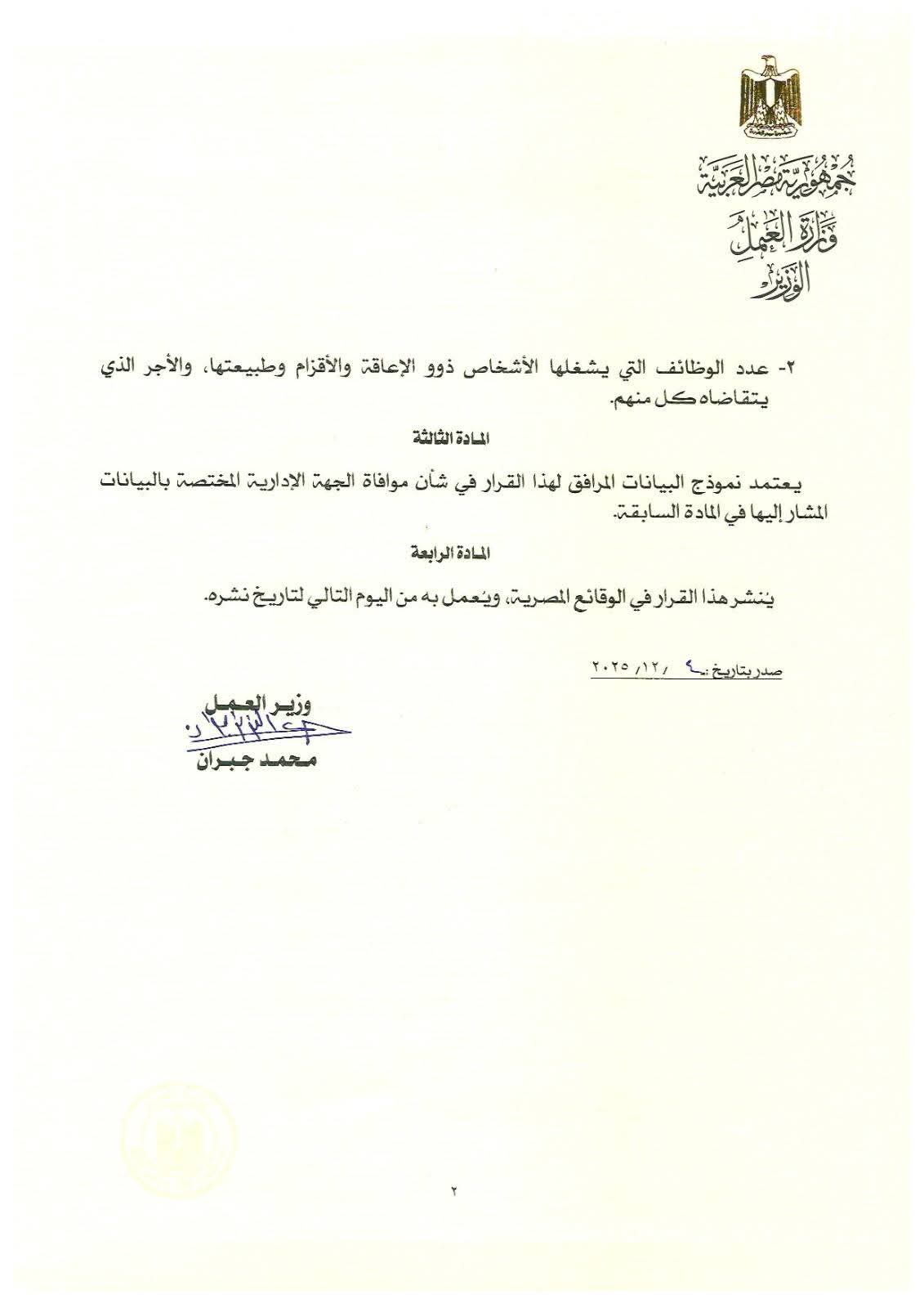 وزير العمل يصدر قرارًا وزاريًا رقم (271) لسنة 2025 بشأن تنظيم تشغيل الأشخاص ذوي الإعاقة.