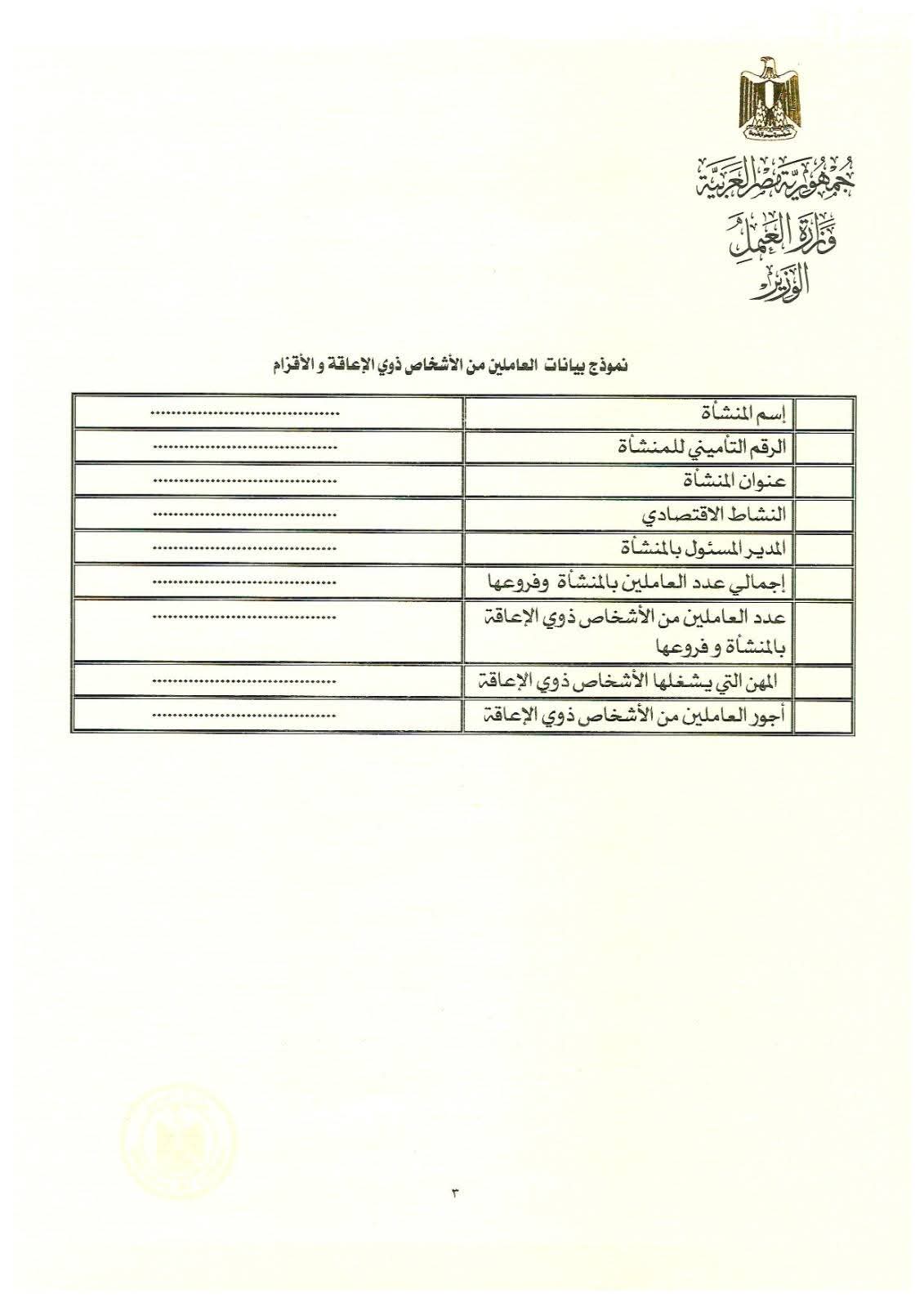 وتضمن القرار الوزاري رقم (271) لسنة 2025 نموذجًا معتمدًا لبيانات العاملين من الأشخاص ذوي الإعاقة والأقزام، تلتزم المنشآت باستيفائه وإرساله إلى مديريات العمل المختصة، ويشمل جدولًا بيانيًا موحدًا يتضمن البيانات التالية: